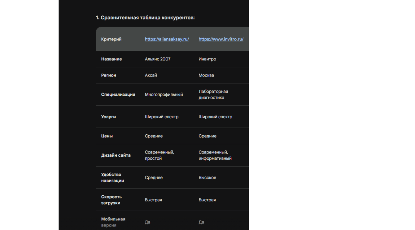 — Анализ сайтов конкурентов с помощью ИИ и представление предложений для увеличения конкурентоспособности по части юзабилити;