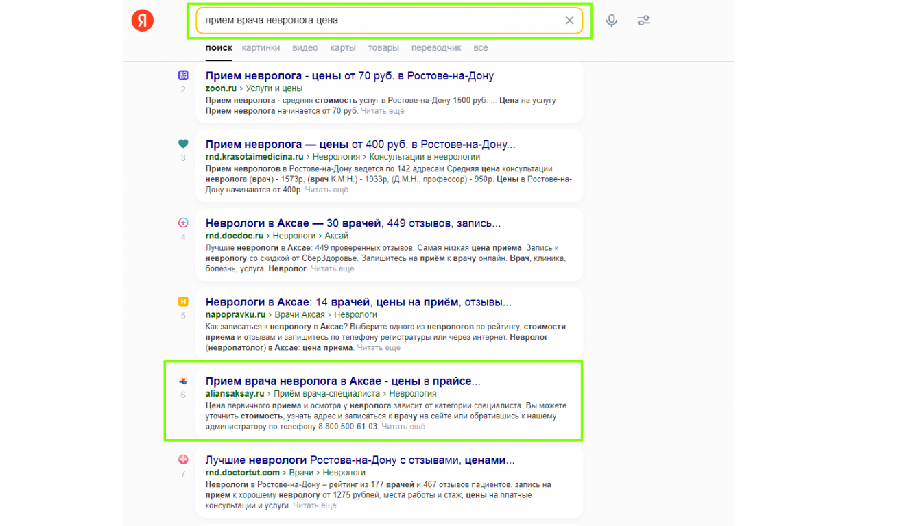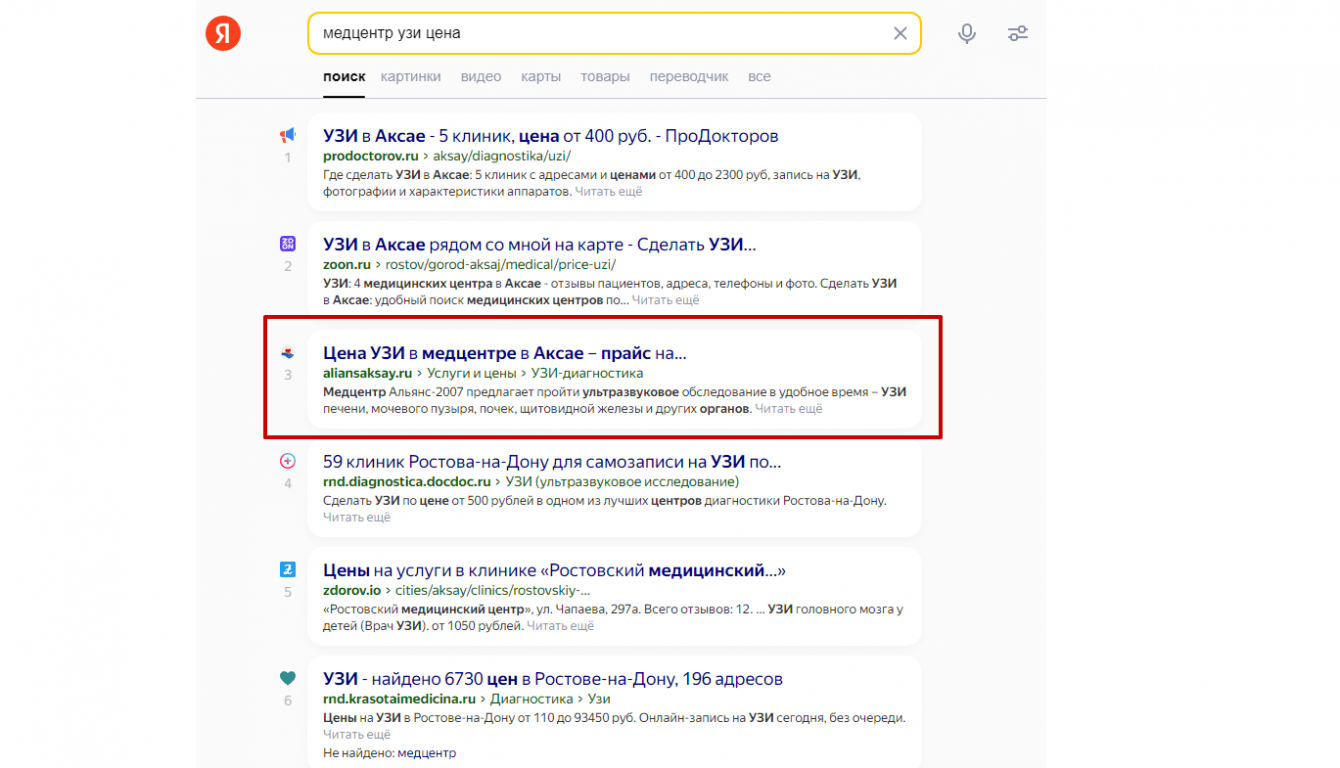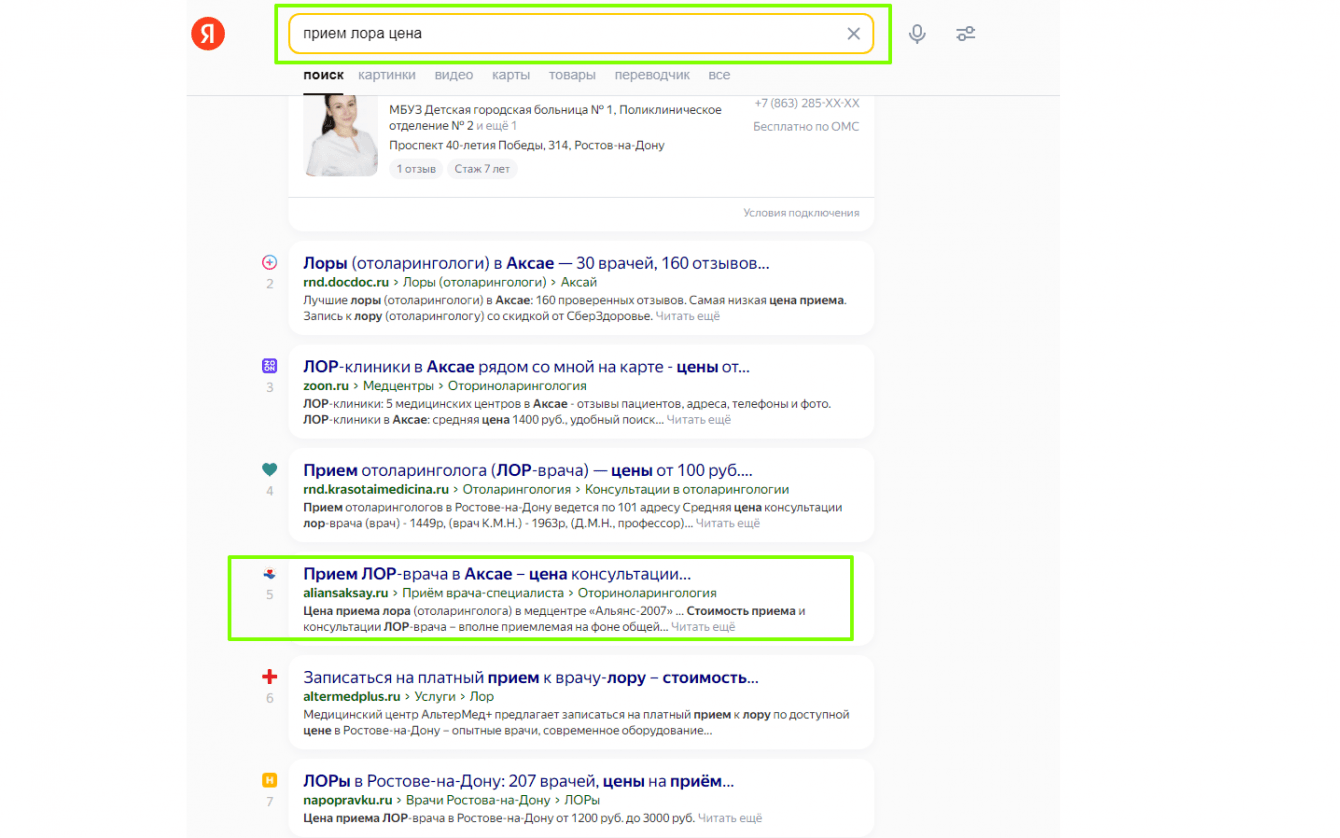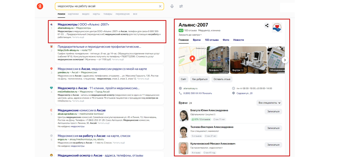 Поиск по врачам, а не только услугам – реализована настройка микроразметки для формирования карточек специалистов в поиске, так как у врачей есть авторитет и репутация в своей области, и это позволяет привлекать и переманивать клиентов в клиники, где принимает тот или иной врач.