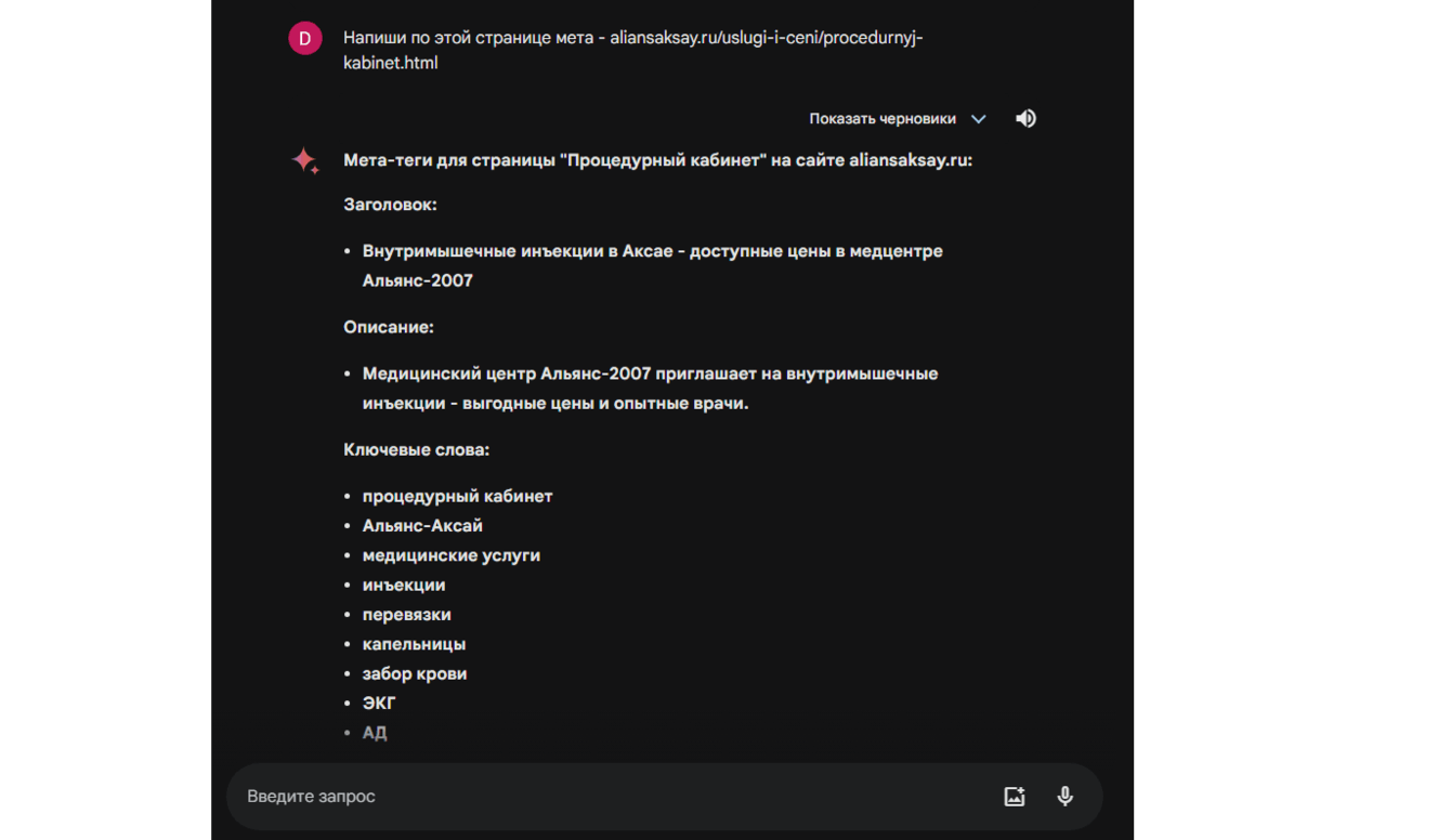 — Написание статей для блога с помощью ИИ: с его помощью были написаны статьи для блога, имеющие прямое вхождение информационных запросов. После подготовки материал в обязательном порядке утверждался квалифицированным специалистом;