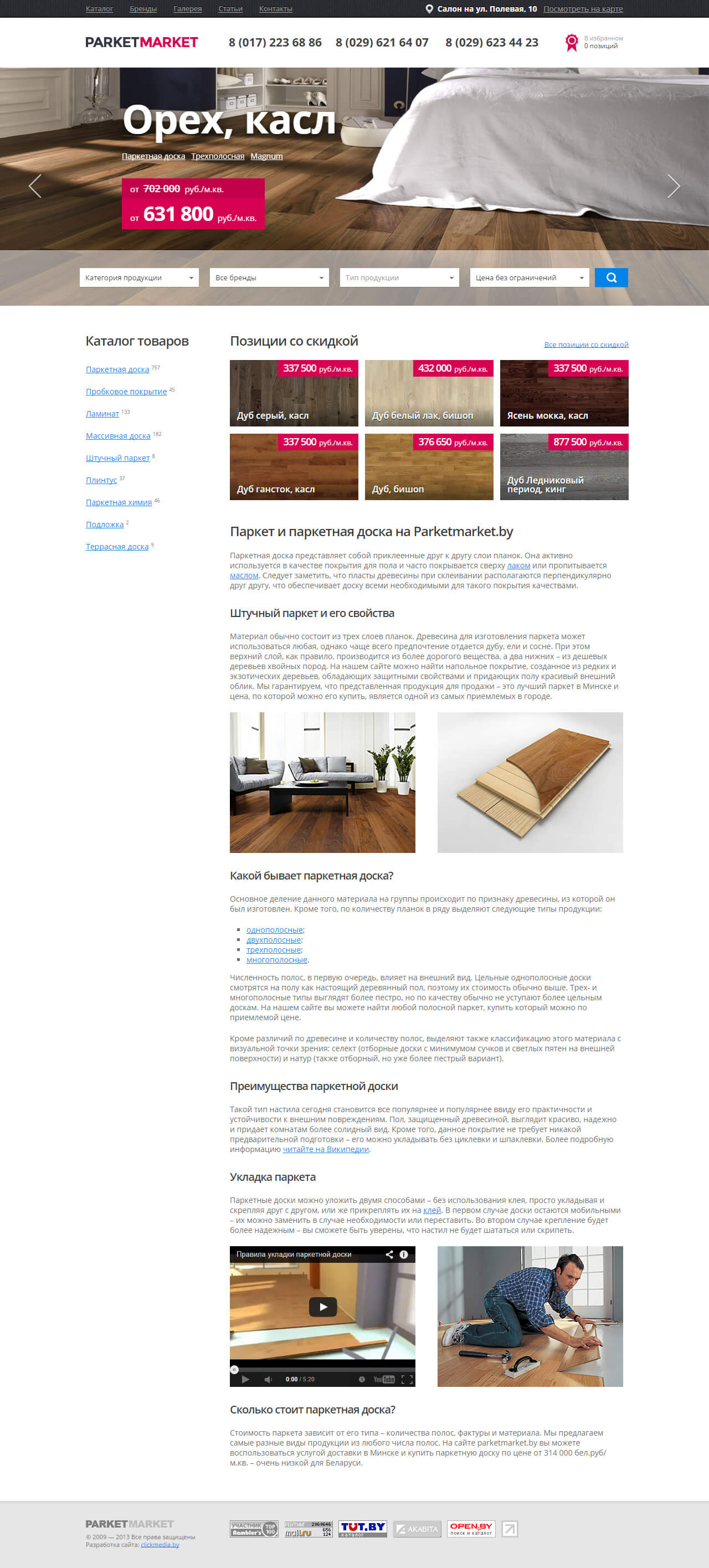 Разработать интернет-магазин для компании «Parketmarket», представляющей в Беларуси напольные покрытия из паркетной, террасной или массивной доски, ламината и пробкового материала и увеличить поисковый трафик до 2500 чел./мес.