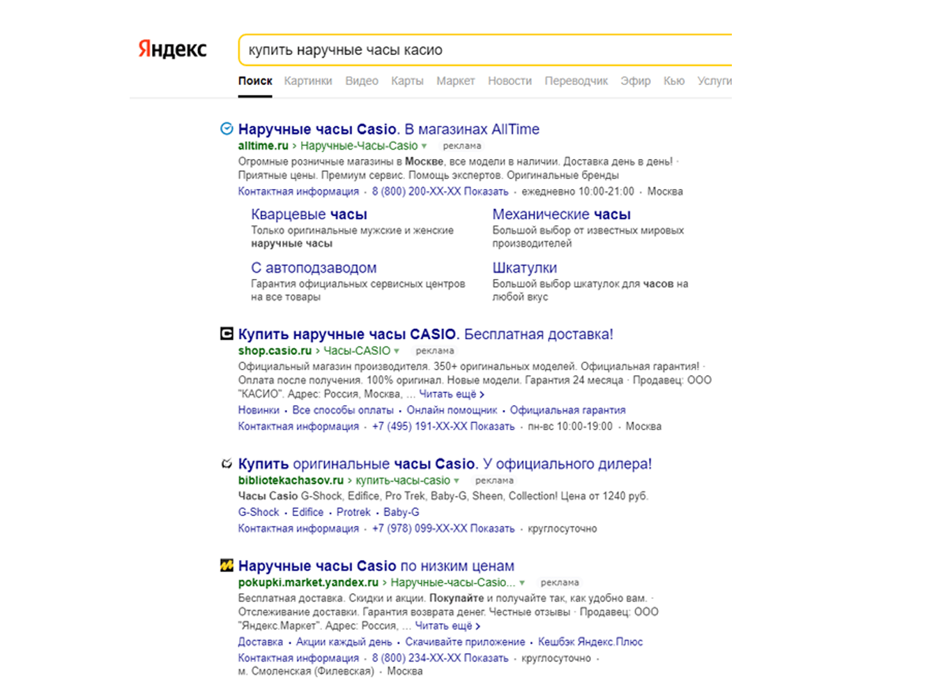 Выдача Яндекса наполнена рекламой и колдунщиками (элементы поиска с информацией из различных сервисов Яндекса вроде Яндекс.Маркета).
