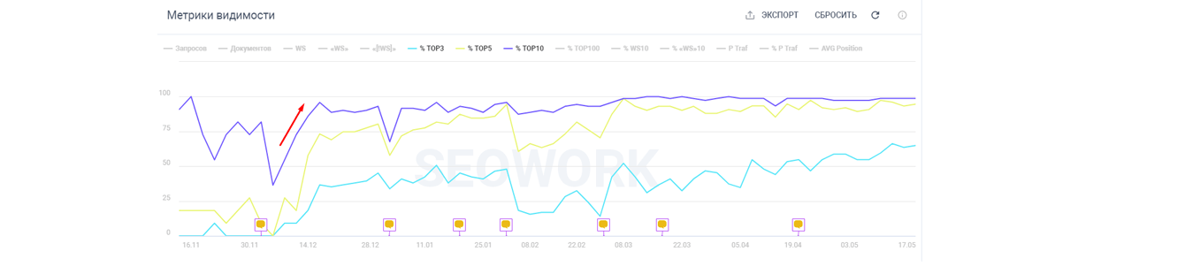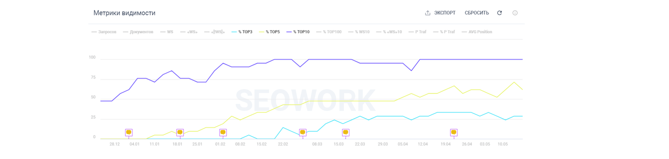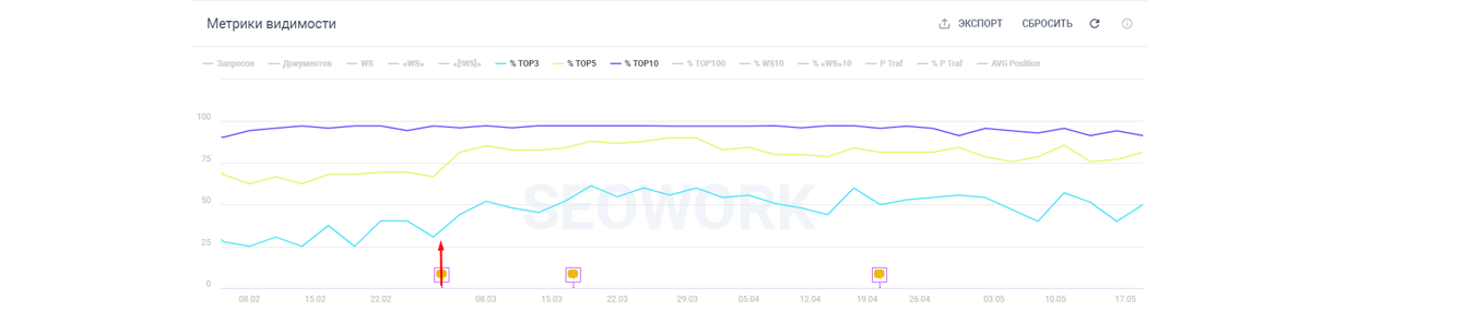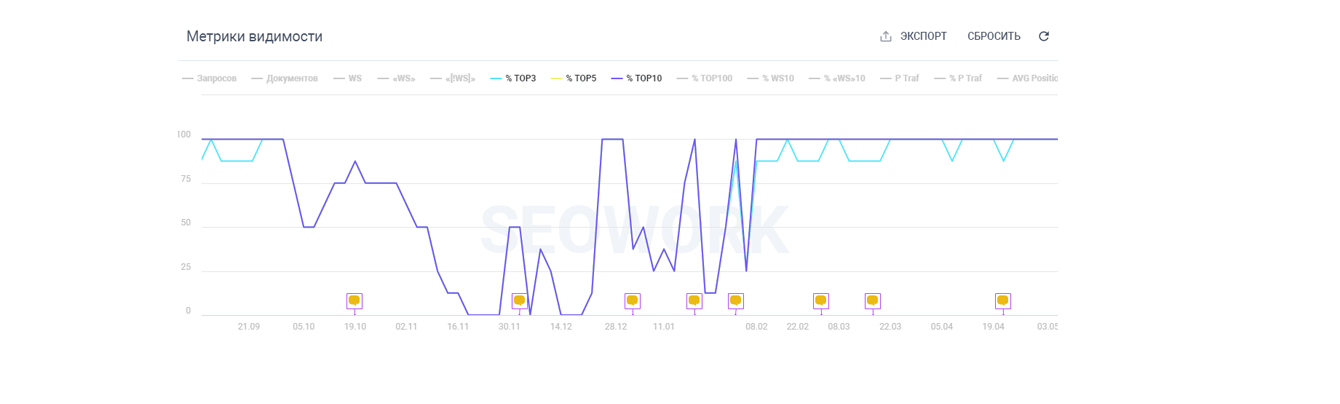 С помощью системы аналитики SEOWORK мы отследили, что мигает выдача по конкретным запросам.