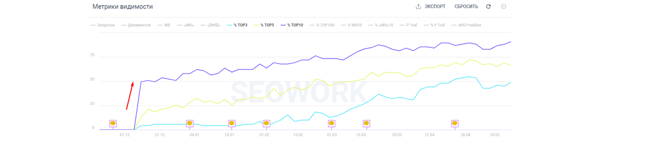 Шаблонной оптимизации не всегда достаточно, поэтому на регулярной основе анализируется видимость страниц по запросам. Для страниц с наименьшей видимостью проводится точечная оптимизация – метатеги прописываются индивидуально на основе анализа выдачи с учетом частотности запросов и других факторов.