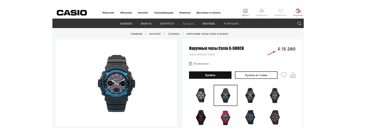 Кроме того, потенциальным покупателям важно иметь возможность в деталях рассмотреть часы, получить полное представление о модели и обойтись без поездки в магазин, заказав доставку на сайте. Учитывая пожелания клиентов мы разместили на сайте изображения в высоком разрешении, и по просьбе Casio настроили особое отображение фотографий в карточках товаров и каталоге: часы на изображениях максимально совпадают по размеру с реальными моделями. На всех остальных официальных сайтах Casio (в Японии, США и Европе) это требование соблюдено, а у дилеров и дистрибьюторов, как правило, не выполняется.