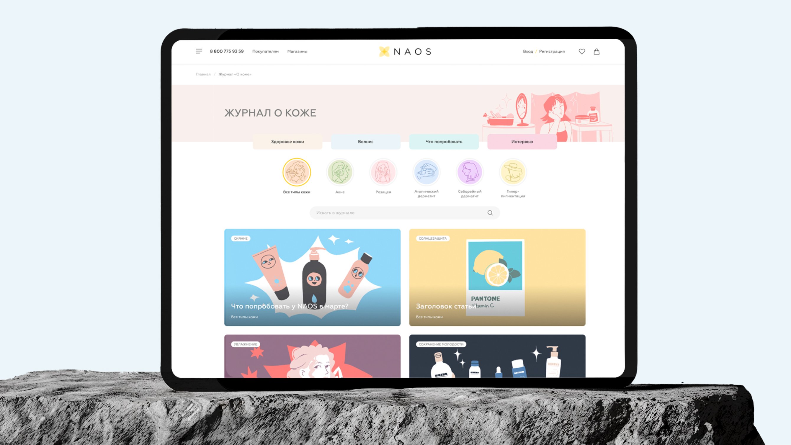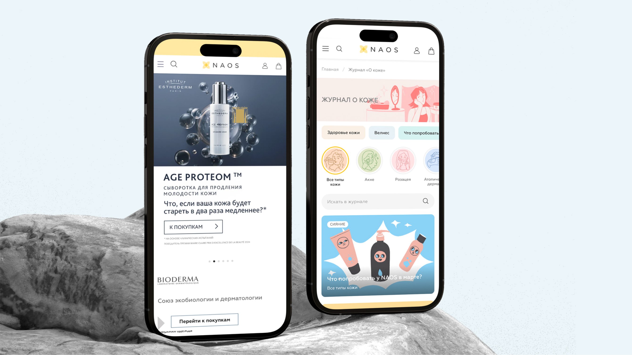 Мы предложили клиенту использовать фирменный шрифт NAOS в качестве основного шрифта для магазинов и выбрать нейтральные цвета для активных элементов интерфейса площадки. А уникальность дизайна двух разных онлайн-витрин можно достичь с помощью баннеров и дополнительных графических элементов.