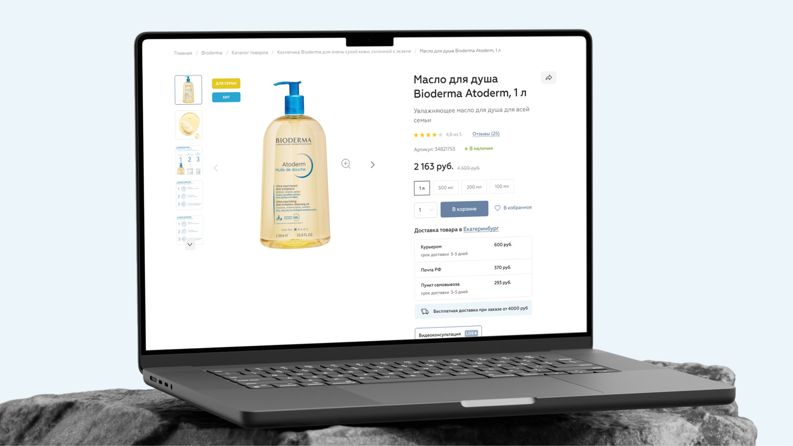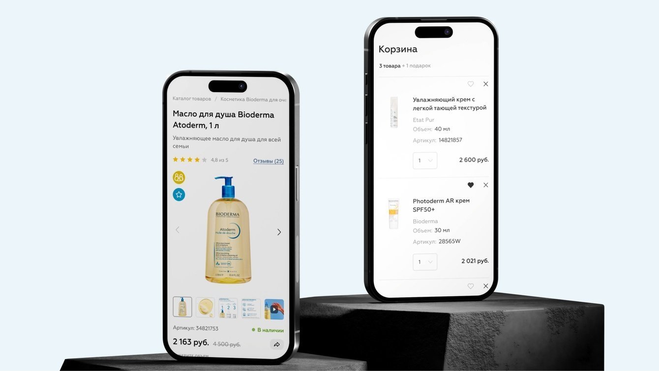 Мы спроектировали удобную структуру каталога, добавив для бренда Bioderma возможность персонализации по типам кожи и поиск по проблемам, а для Institut Esthederm — поиск по назначению для разных зон.
