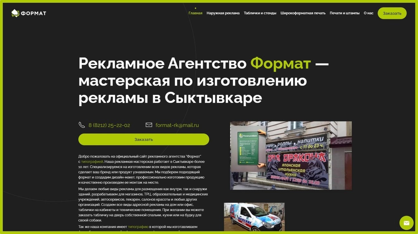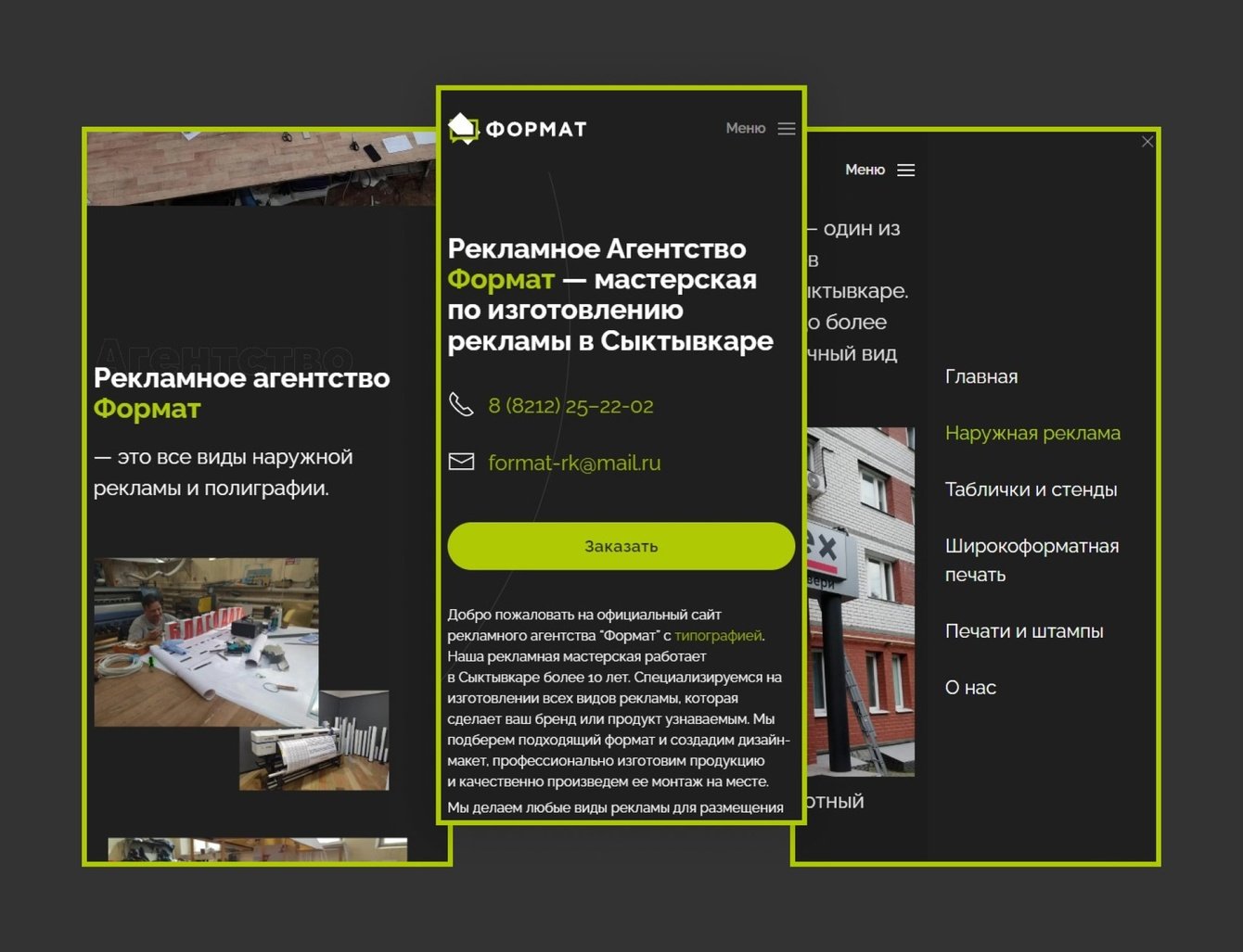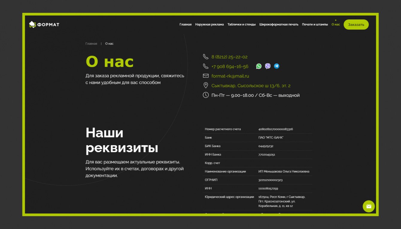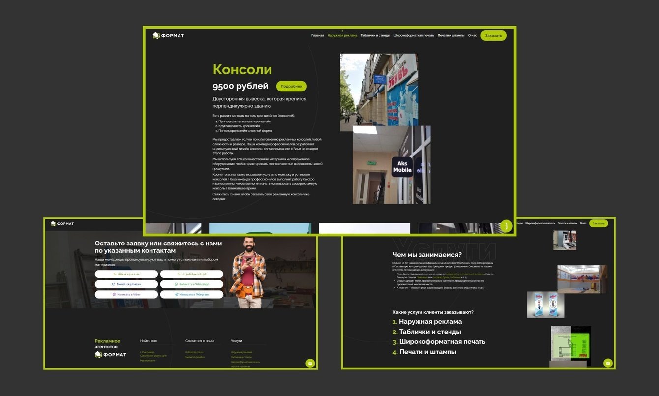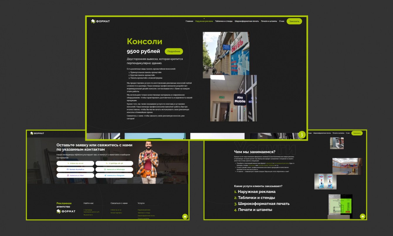 Чистые линии, смелое использование брендовых цветов и интерактивные элементы – мы создали визуально привлекательный интерфейс, который не только выделяет «Формат» среди конкурентов, но и демонстрирует их креативный подход к рекламе. Интуитивно понятная навигация и структурированное представление информации подчеркивают профессионализм и заботу о клиенте.