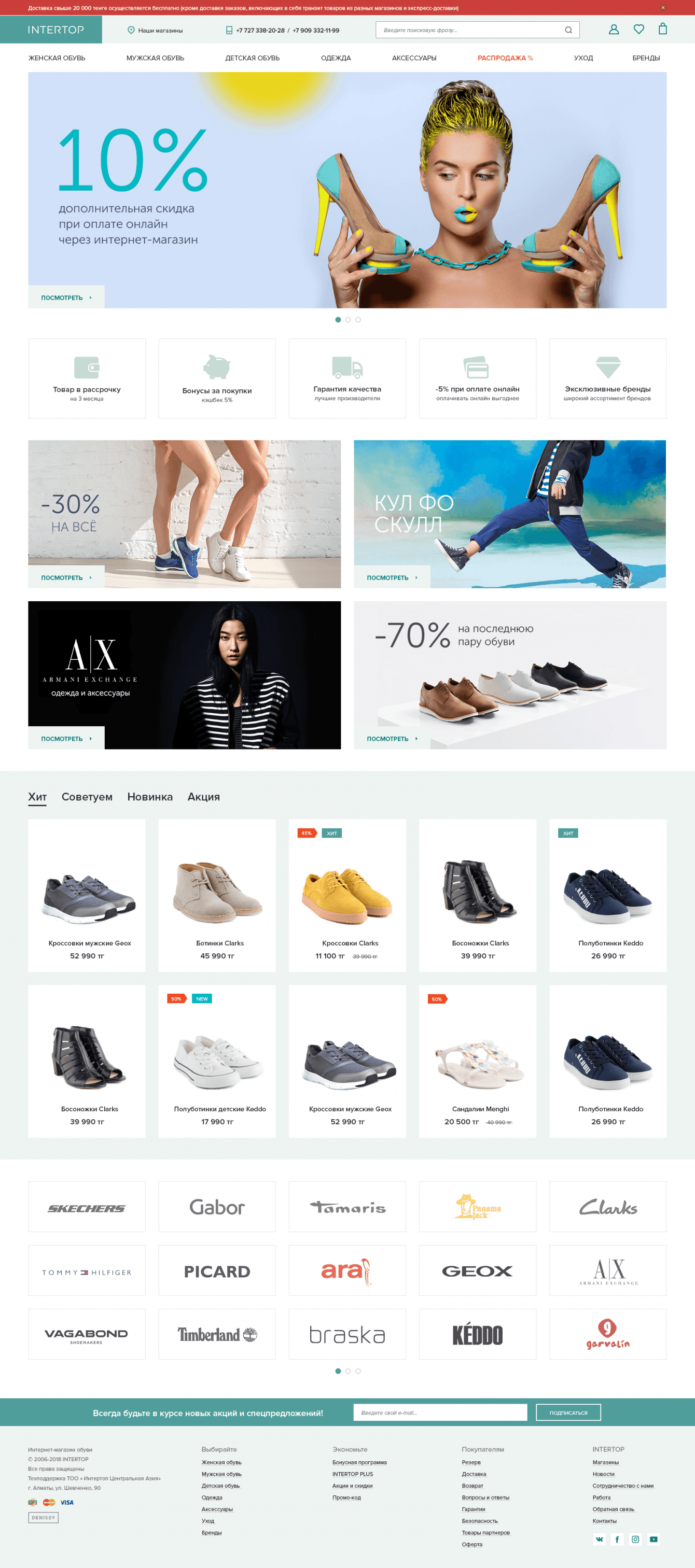 Сегодня INTERTOP остается безусловным лидером рынка. Сеть включает более 80 магазинов в Украине и Казахстане, в которых представлена продукция Geox, Clarks, Skechers, Timberland, Braska, Armani Jeans, Tommy Hilfiger и других ведущих мировых брендов.