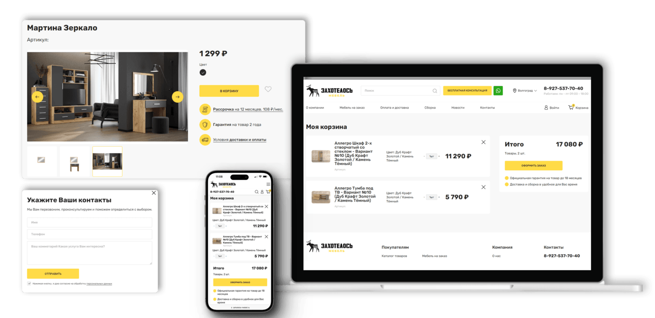 По исследованию — 70% пользователей интернет-магазинов мебели находятся на проекте с мобильного телефона. Именно для этого мы сделали глубокий акцент на мобильную версию. Удобный и отдельно спроектированный интерфейс не оставит равнодушным!