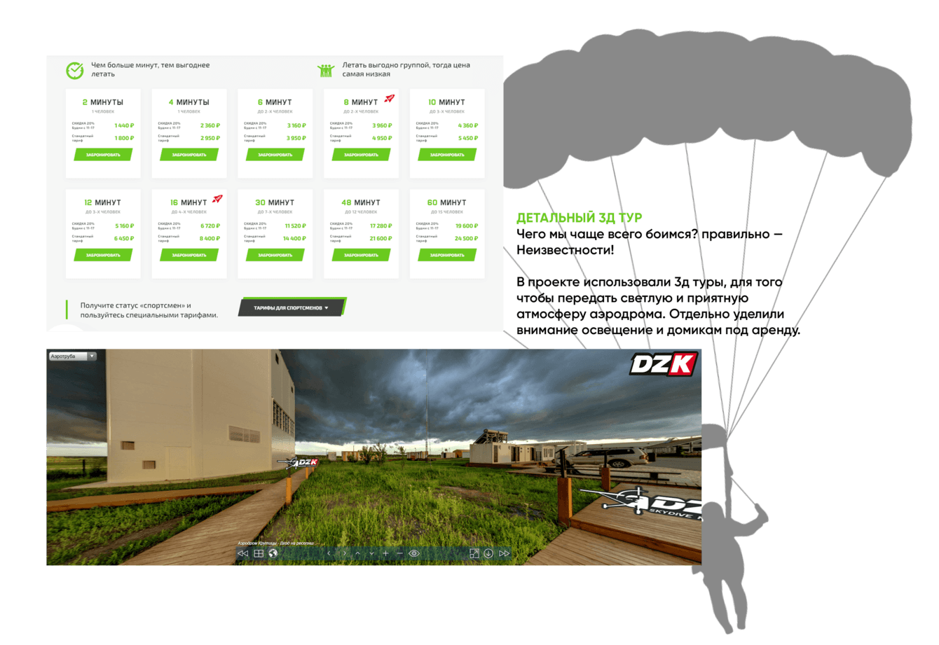Разработать удобный сайт для Аэроклуба DZK Krasnodar. Разработанный сайт должен вдохновлять посетителя совершить «тот самый» прыжок с парашютом, а так же передавать атмосферу спорта, динамики и адреналина.