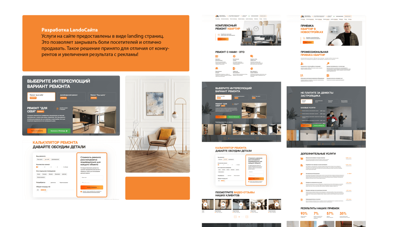 Клиентом была поставлена задача по созданию сайта для компании по ремонту и дизайну помещений. Сайт должен быть адаптирован под мобильные устройства, иметь удобный юзабилити и инструменты, помогающие клиентам выполнить расчет цены онлайн.