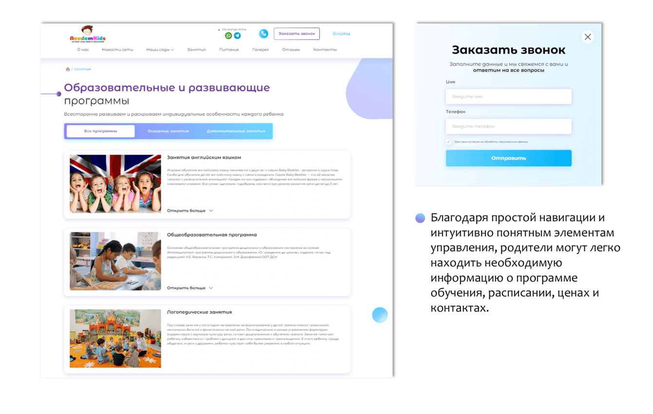 Разработка корпоративного сайта частного детского сада для предоставления информации о оказываемых услугах. Основная задача личного кабинета обеспечить родителям — удобный доступ к информации о квитанциях на услуги, предоставляемые их детям, а также упростить оплату.