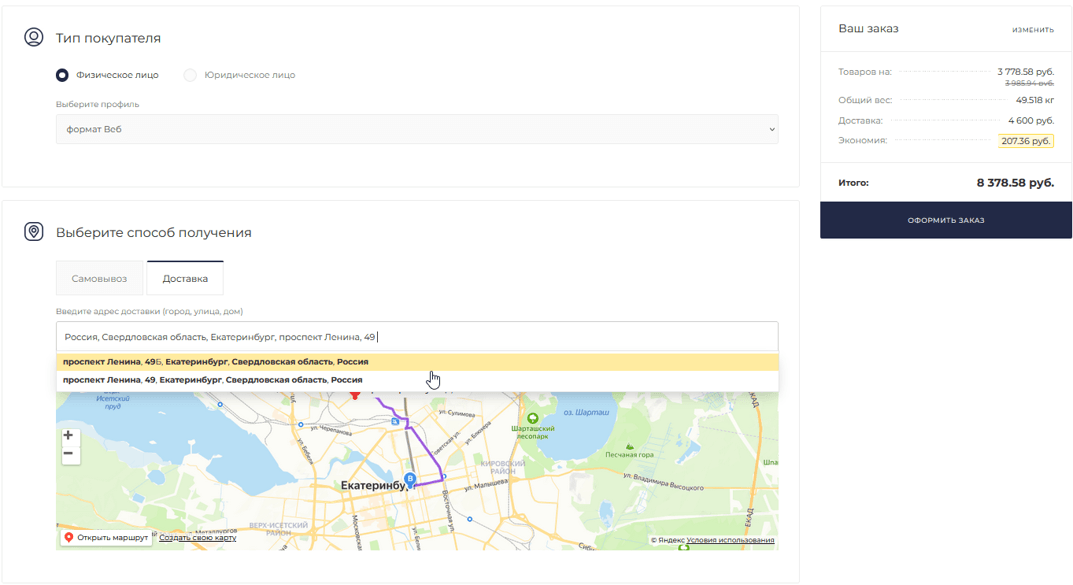 Для того, чтобы сделать возможным какой-либо расчёт, мы решили настроить интеграцию с Яндекс картами, на которой клиент может указать точный адрес доставки, чтобы система могла определить, в какую зону доставки этот адрес попадает. При указании вдреса на карте сразу отображается маршрут доставки со склада.