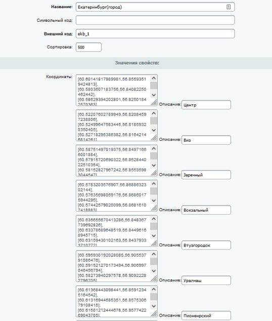 Вся информация по зонам доставки, включая данные по тарифам, хранится в инфоблоках на сайте. Вот сохранённые значения для того или иного района в административной части сайта:
