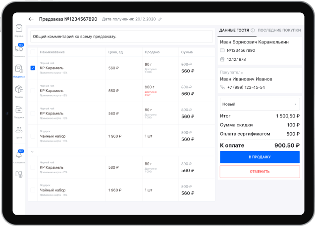 - работу с предзаказами, которые оформляются через приложение или сайт.