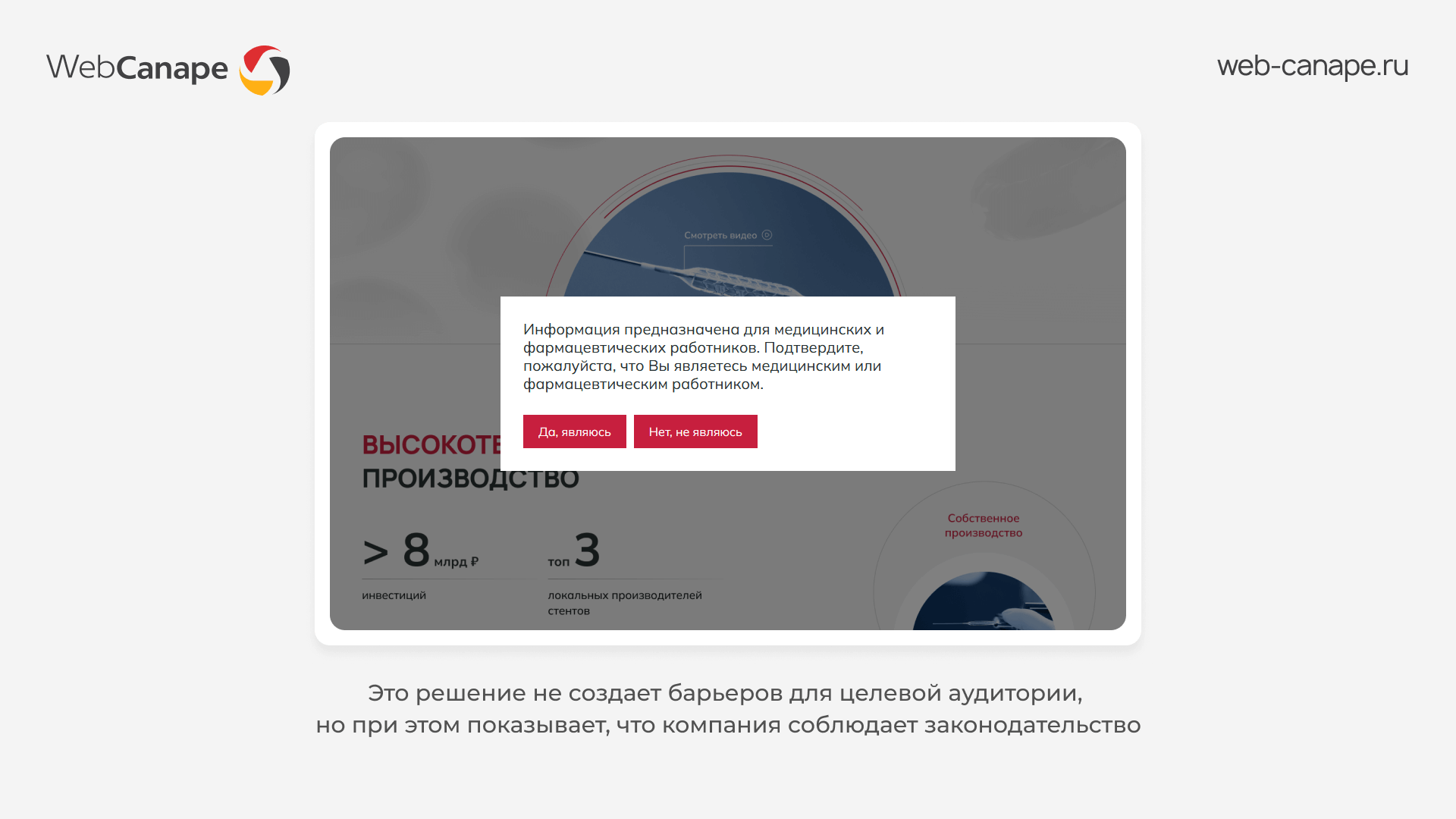 По закону, ряд данных о медицинских изделиях не может быть открыт широкой публике. На сайте мы внедрили проверочный pop-up, кликом по которому пользователь подтверждает, что он — медицинский специалист. Только после этого ему становится доступна информация, предназначенная только для профессионального использования.