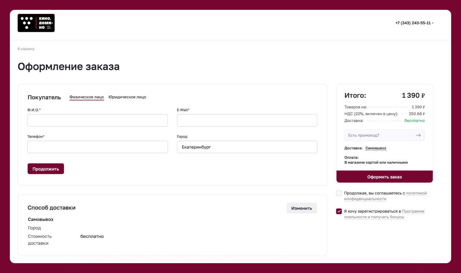 При этом у клиента уже была развитая офлайн-сеть (13 магазинов в Екатеринбурге), и стояла задача связать её с онлайн-каналом: дать пользователю возможность выбрать товар на сайте и забрать его в удобной точке.