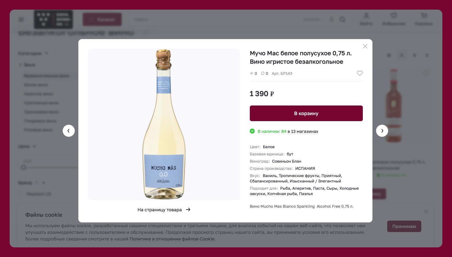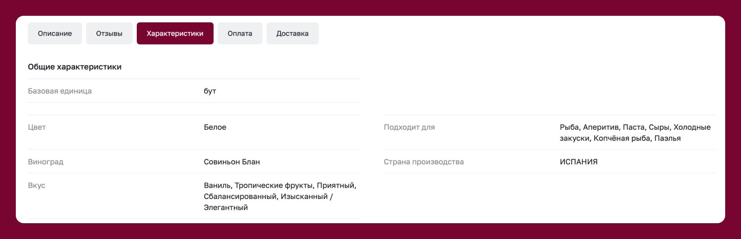 Переходя к карточке любого товара, пользователь может ознакомиться с его описанием, отзывами предыдущих покупателей, условиями оплаты и доставки. Кроме того, нами были сгруппированы характеристики в соответствии с информацией, которую желает получить пользователь вплоть до описания вкуса и подходящих блюд гастрономии: