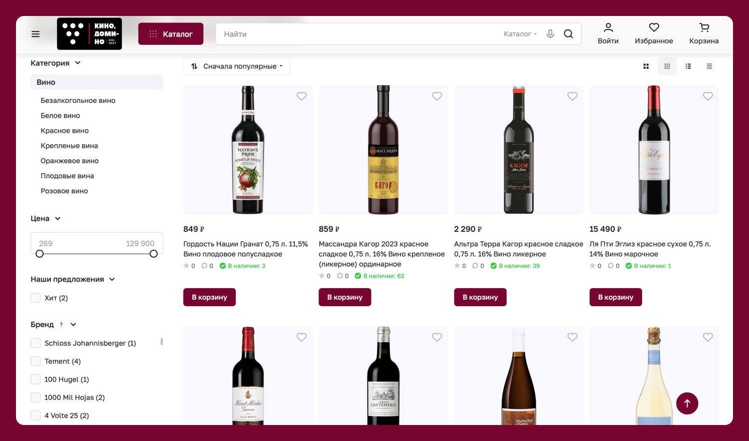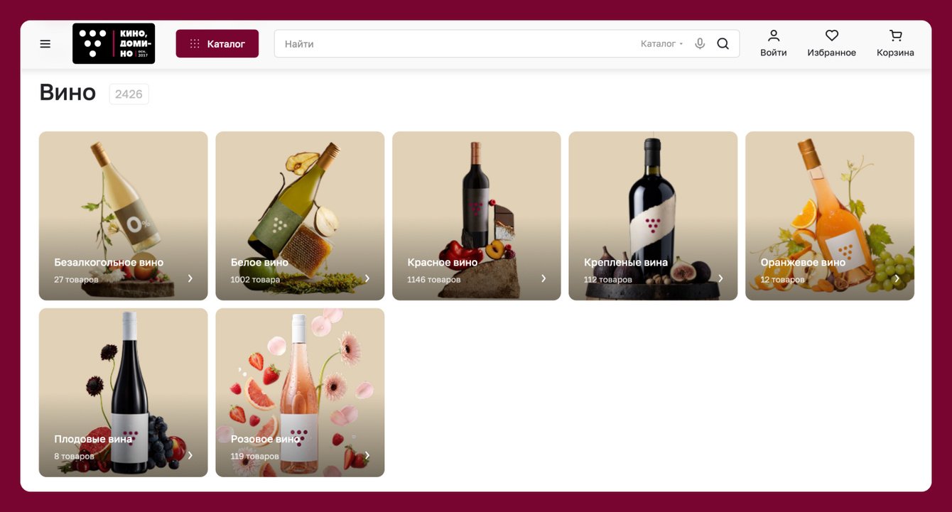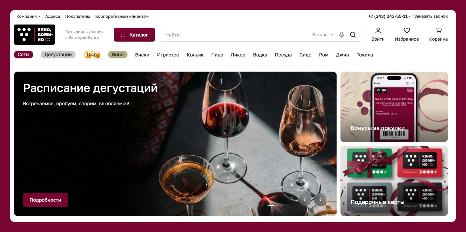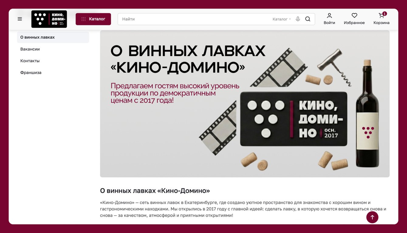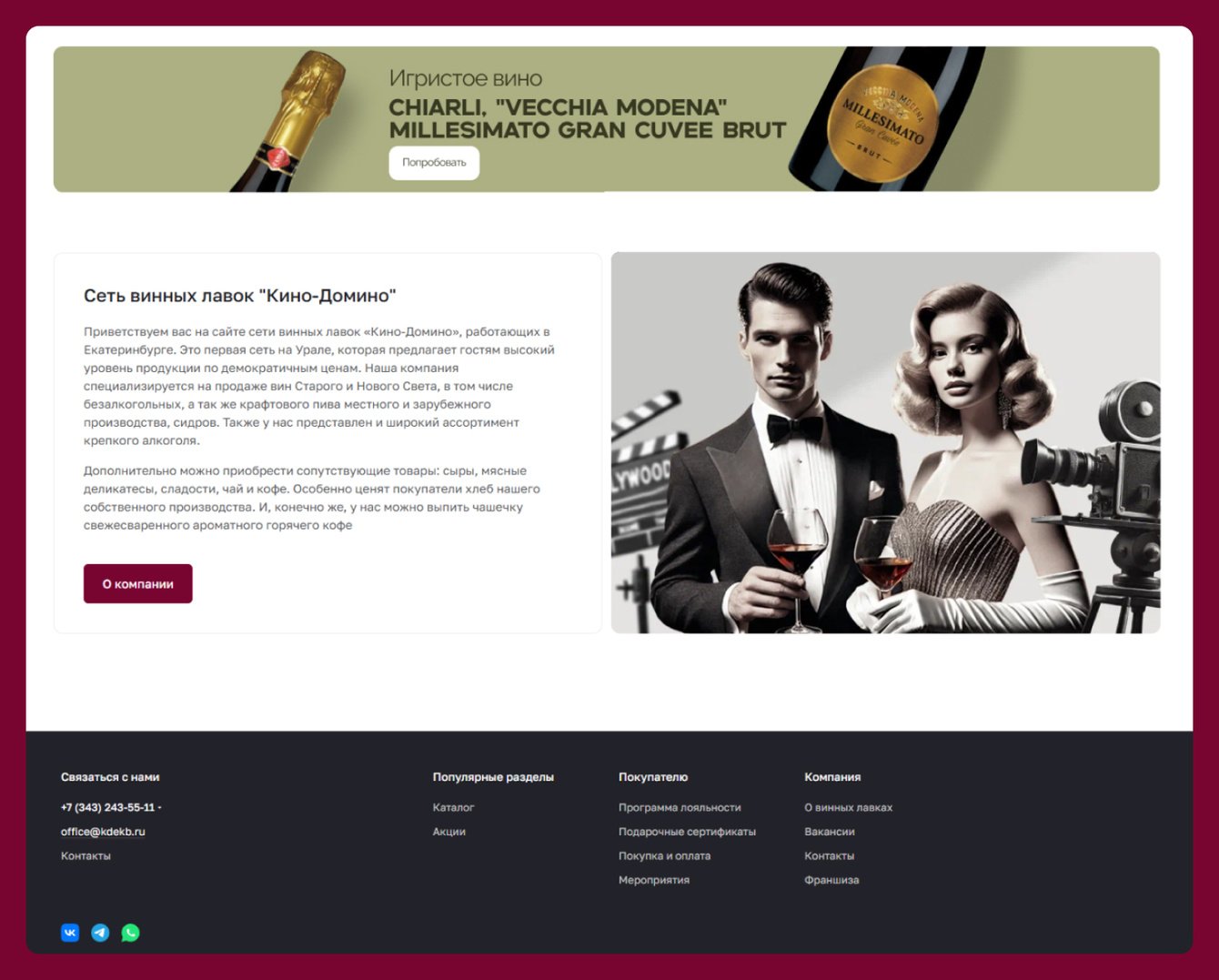 «Кино-Домино» — сеть винных лавок с ассортиментом элитного алкоголя в Екатеринбурге. До начала работ у клиента был сайт на Tilda, который выполнял исключительно информационную функцию: на нём были размещены адреса магазинов и публиковались новости (например, анонсы дегустаций).