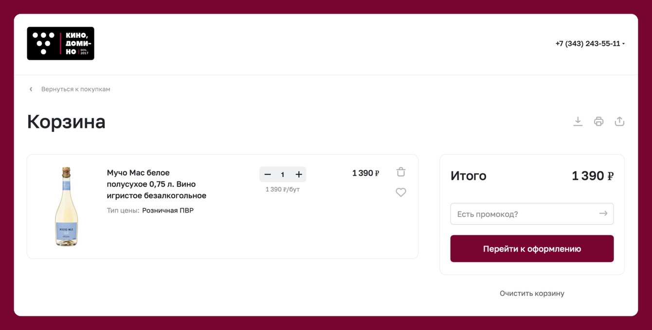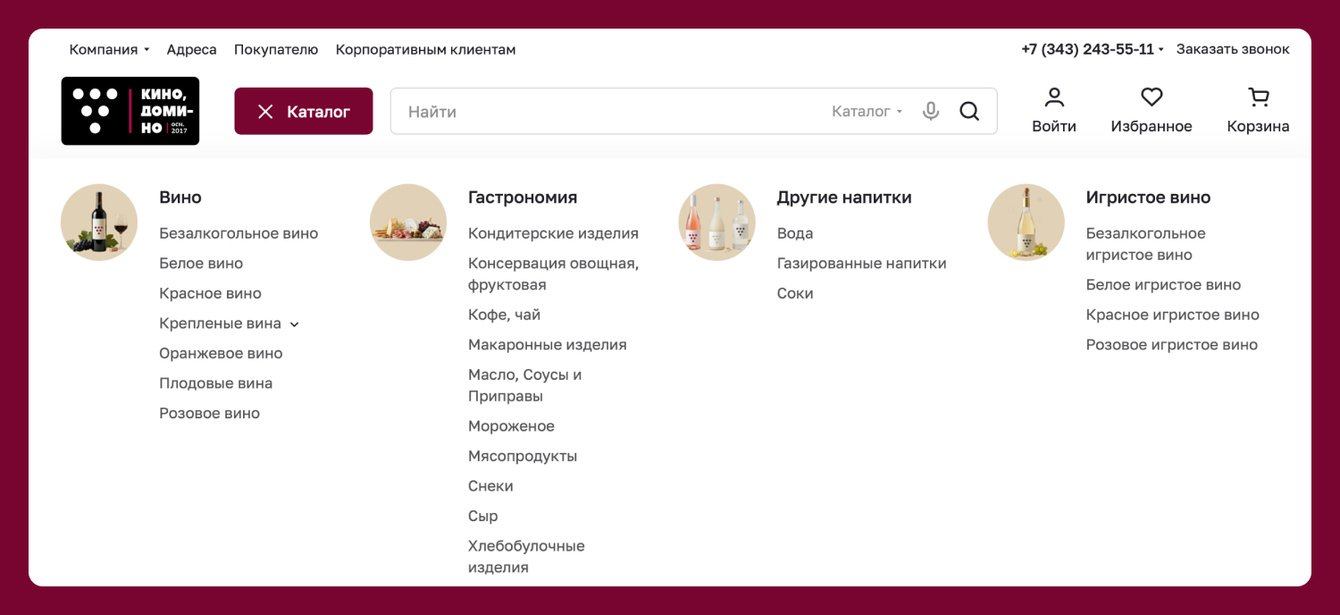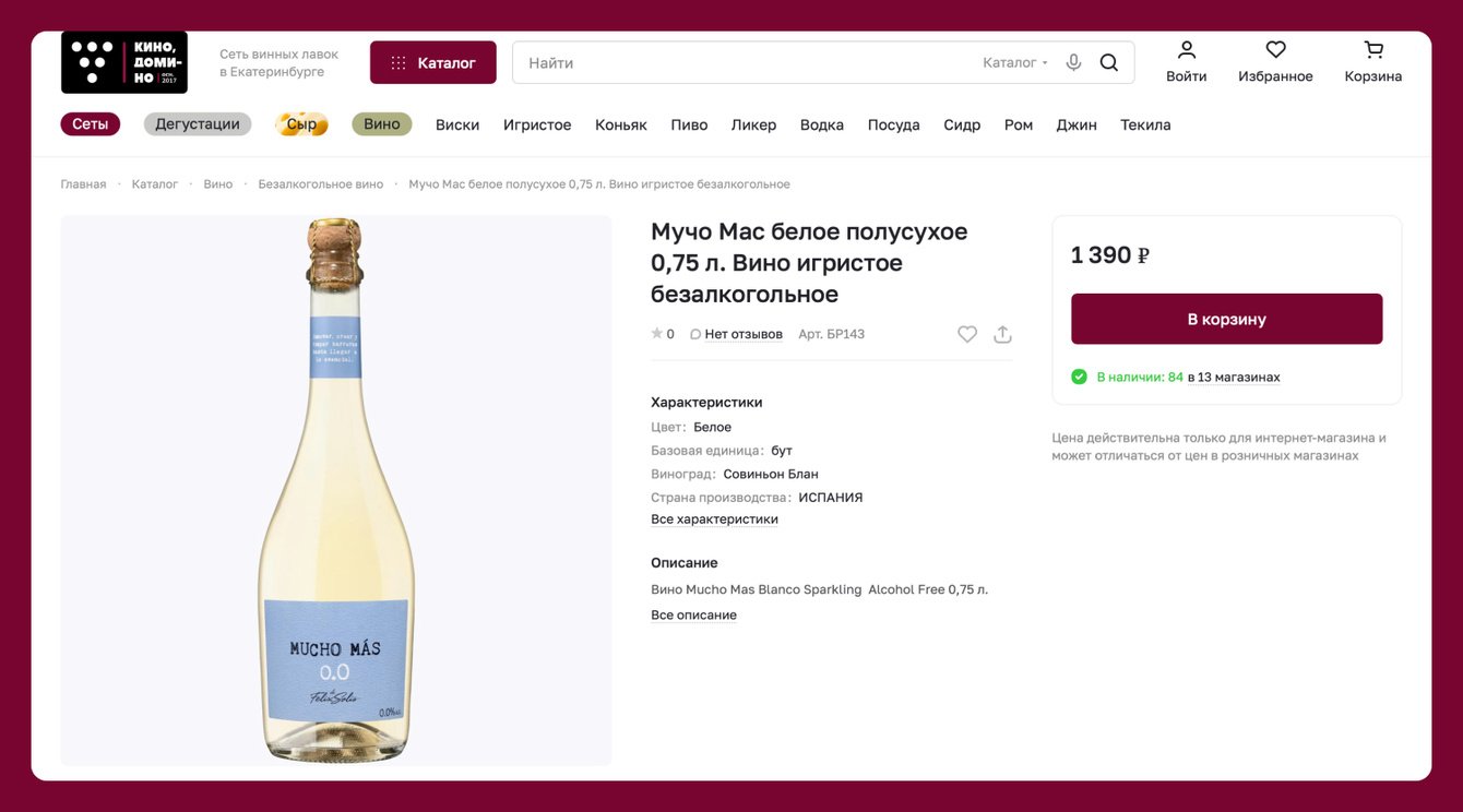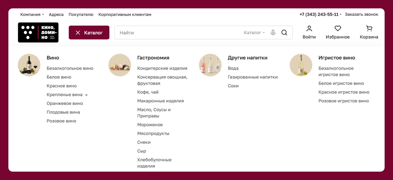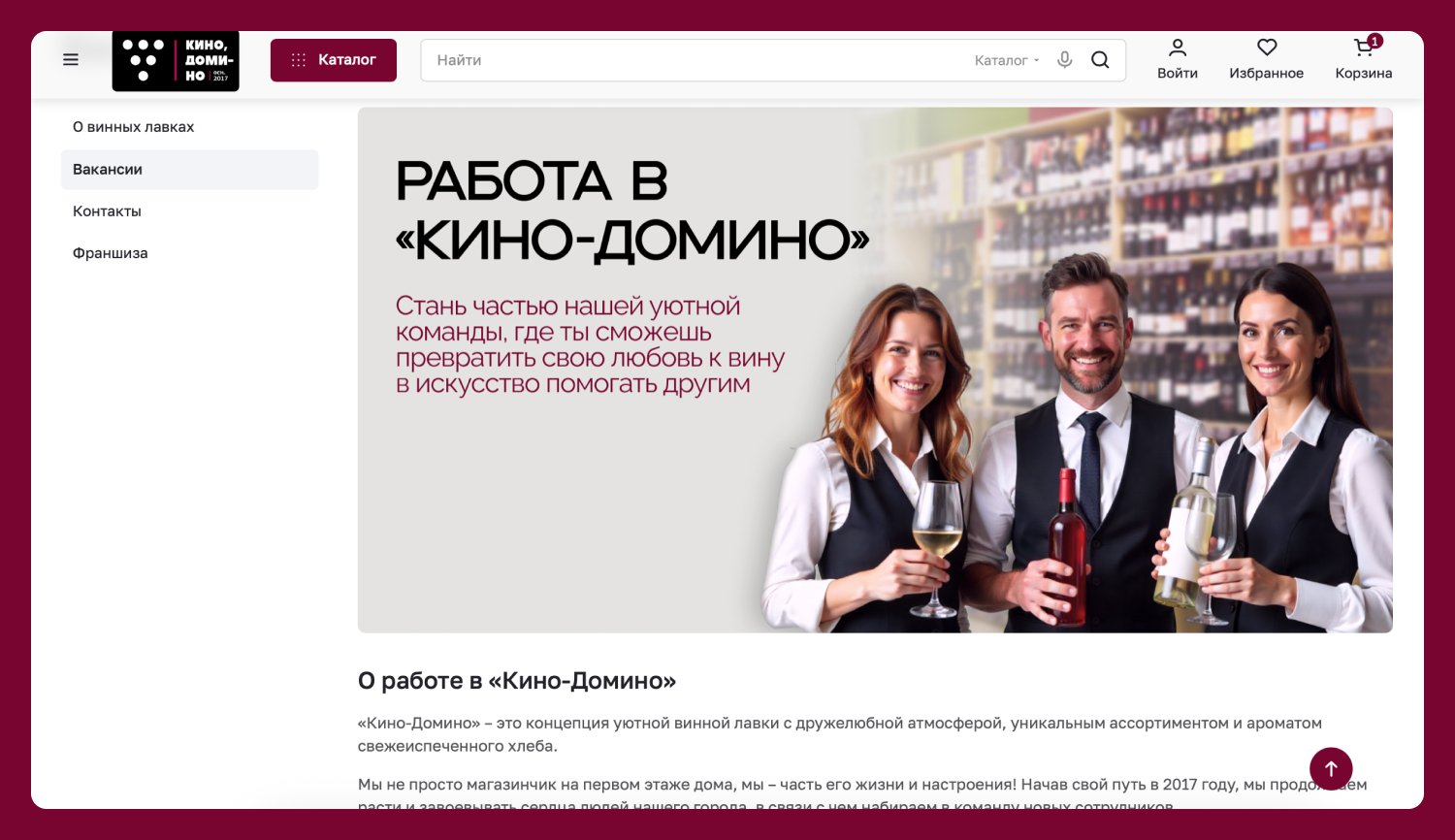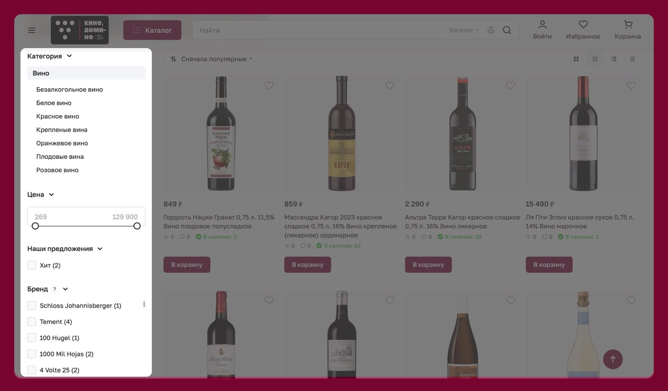 «Кино-Домино» — сеть винных лавок с ассортиментом элитного алкоголя в Екатеринбурге. До начала работ у клиента был сайт на Tilda, который выполнял исключительно информационную функцию: на нём были размещены адреса магазинов и публиковались новости (например, анонсы дегустаций).