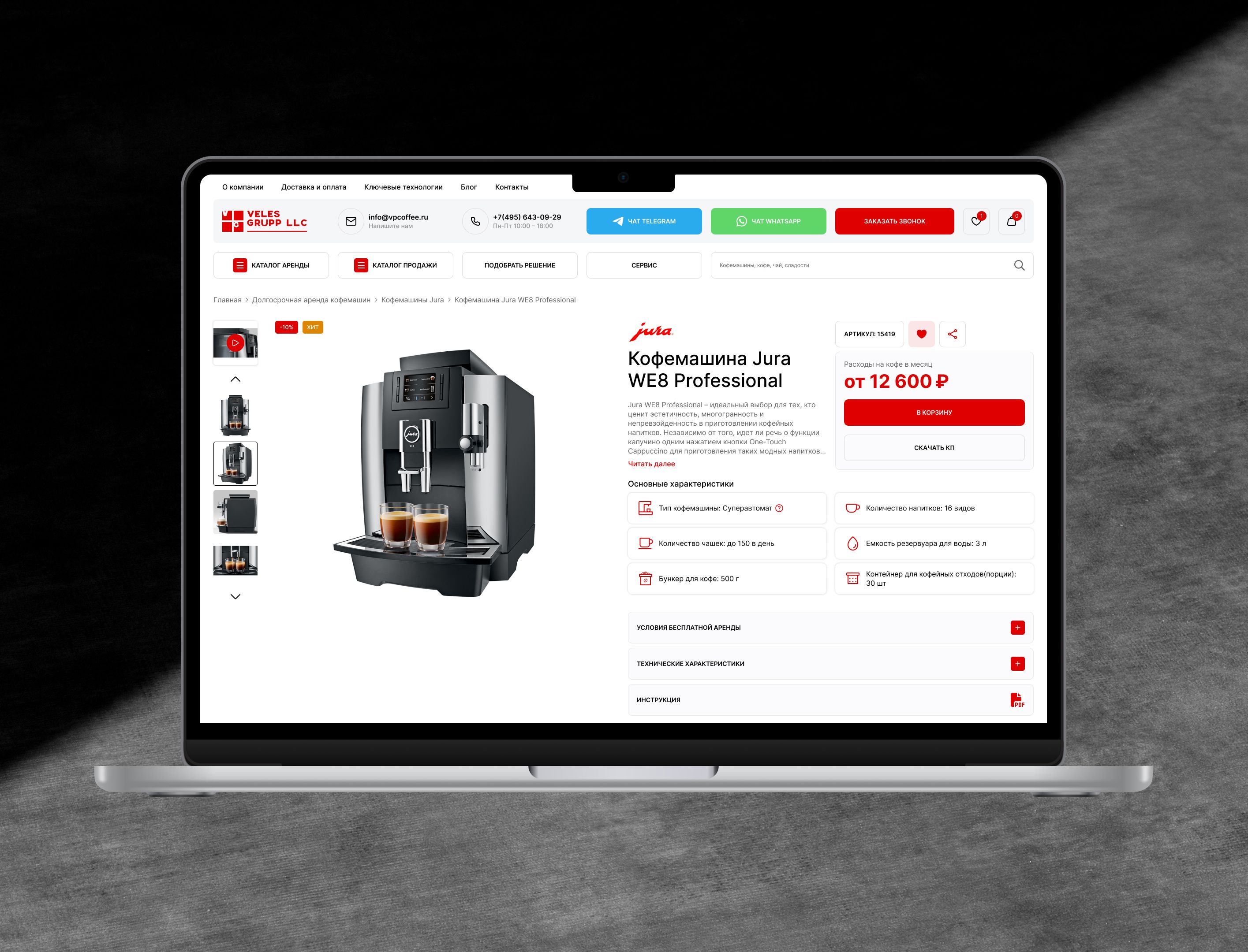 Интернет-магазин компании «Велес Групп» стал удобной и надёжной платформой для покупки кофе и аренды кофемашин. Удобный каталог, подробные описания и информация об аренде повысили доверие клиентов. Сайт способствовал увеличению продаж, укреплению имиджа компании и привлечению новых клиентов, заинтересованных в качественном кофе и удобных условиях аренды кофемашин.
