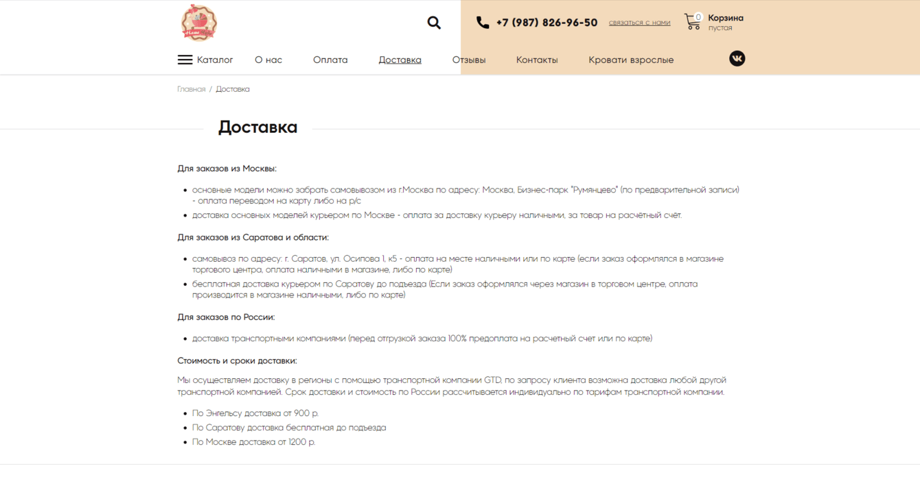 - Текстовая страница "Доставка", содержащая важную информацию о доставке товаров покупателям.