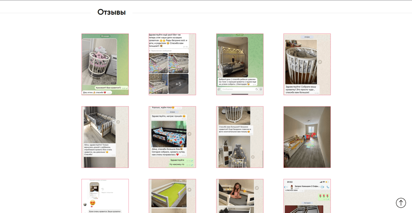 - Страница "Отзывы", где собраны скриншоты отзывов довольных покупателей с реальными фотографиями.