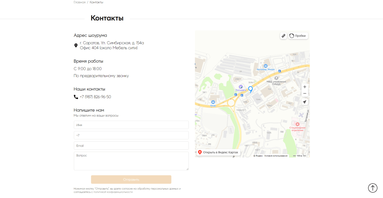 - Страница "Контакты", где пользователи могут ознакомиться с контактной информацией или оставить заявку для связи.