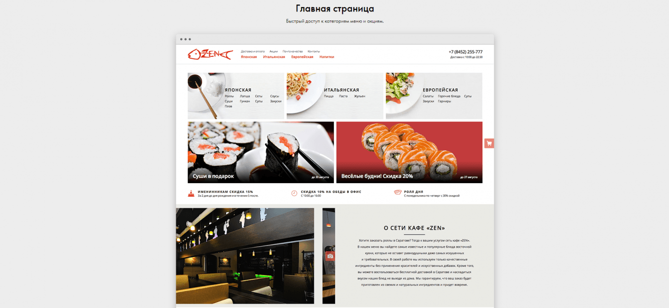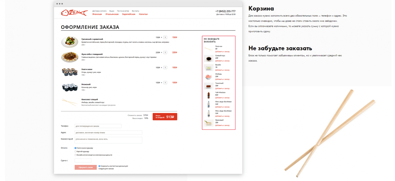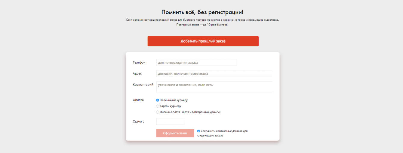 При разработке дизайне и интерфейса мы ориентировались на лёгкость и простоту. Количество шагов для заказа сокращено до одного, данные доставки запоминаются без регистрации.