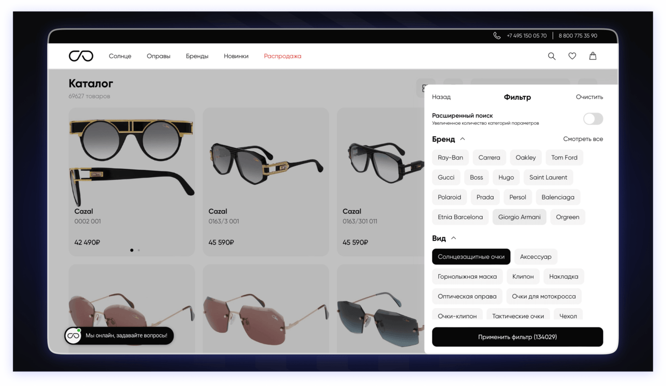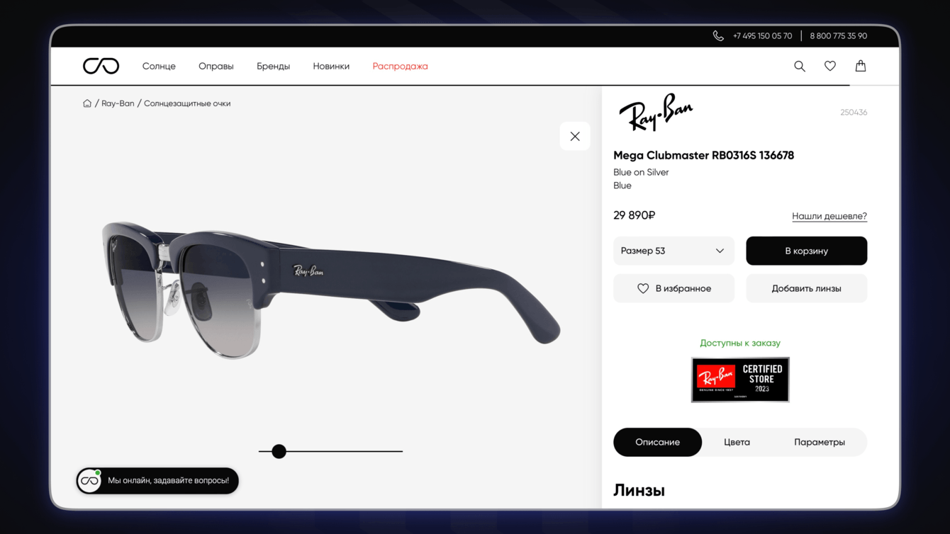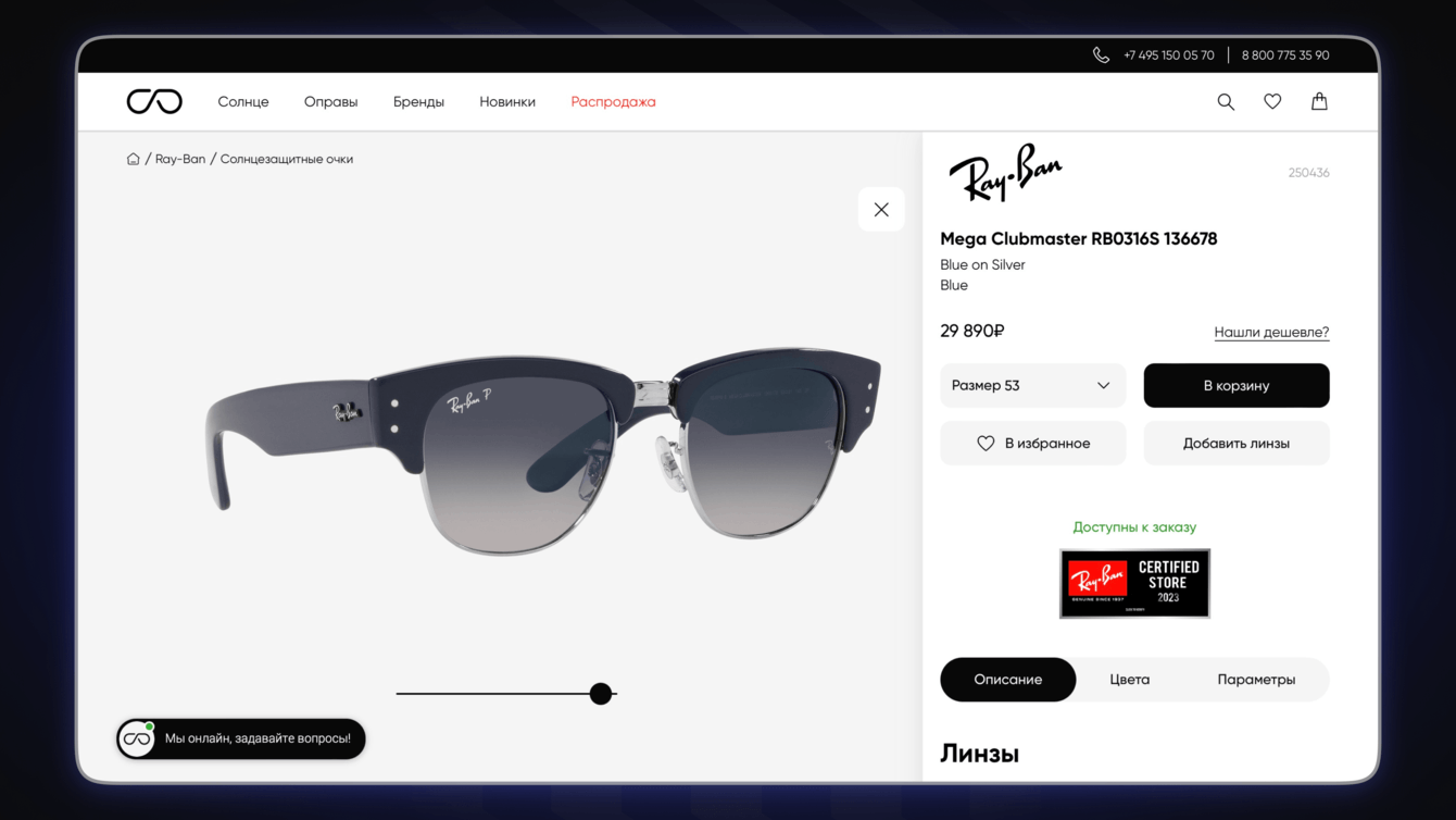 Для реализации сделали админку, в которую заказчик загружает фотографии очков в нужной последовательности. Дальше на фронте мы их будто «склеиваем» и получаем цельную картинку, которая визуально воспринимается, как 3D модель очков. Через стандартную логику слайдера пользователь может посмотреть на очки со всех сторон.