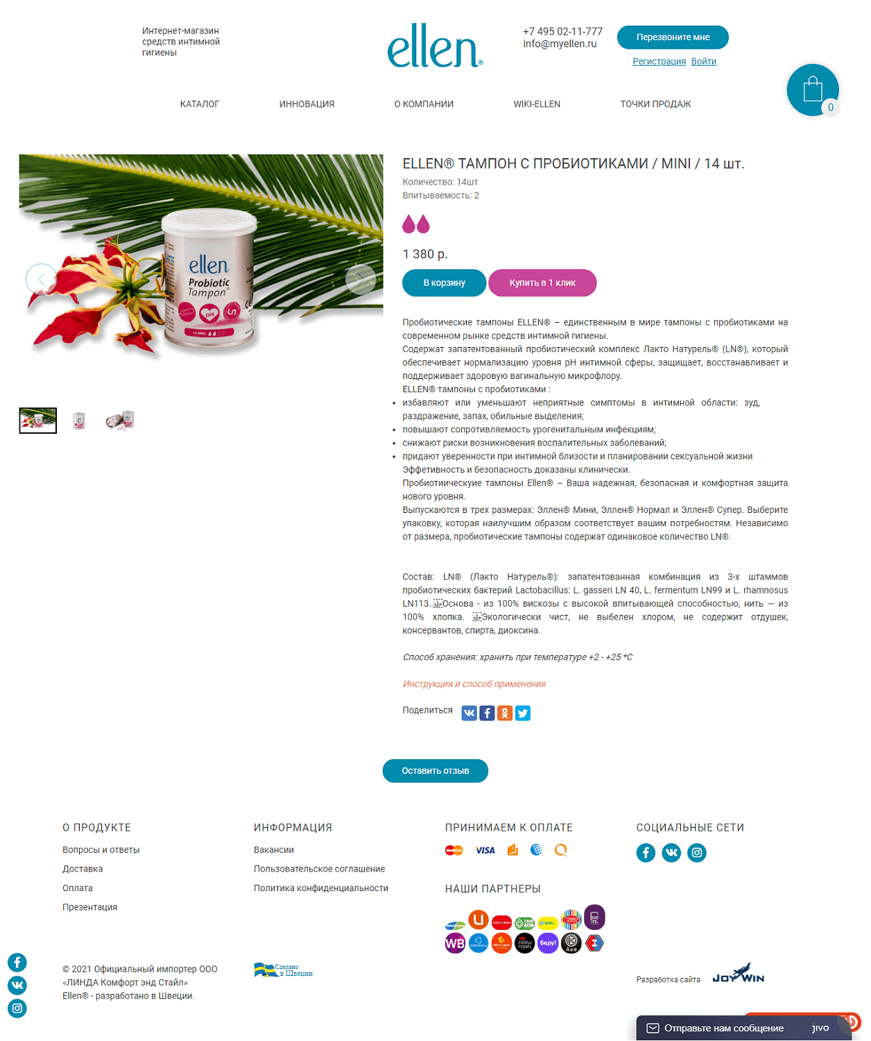 Разработать интернет-магазин для шведской компании Ellen AB. Миссия компании состоит в том, чтобы помочь женщинам в сохранении здорового баланса интимной флоры, предоставляя превосходные инновационные и простые в использовании продукты, эффективность которых научно обоснована. Сайт позволит познакомиться с уникальной продукцией большому количеству потребителей.