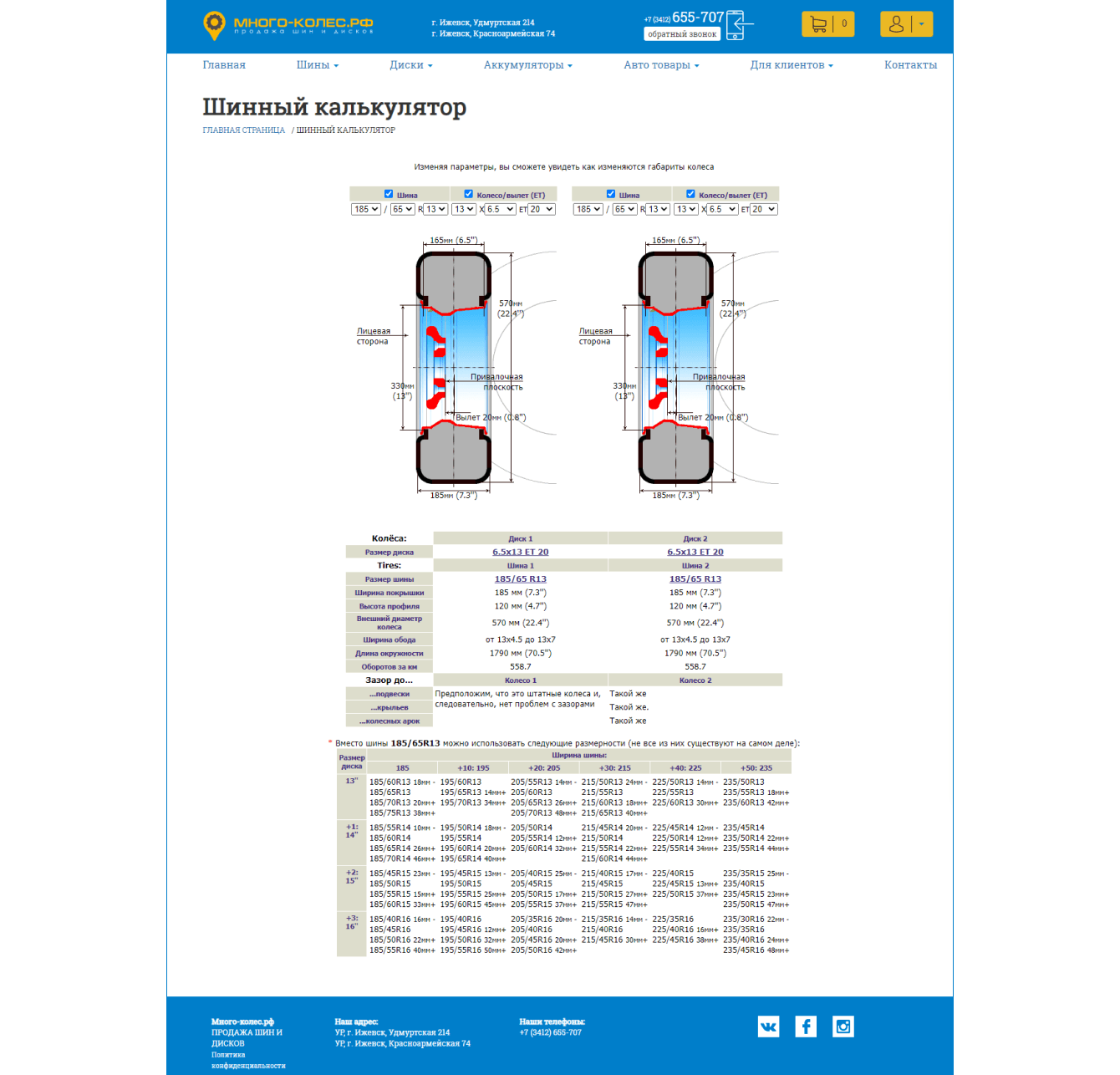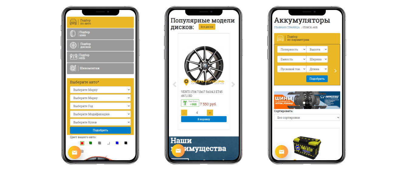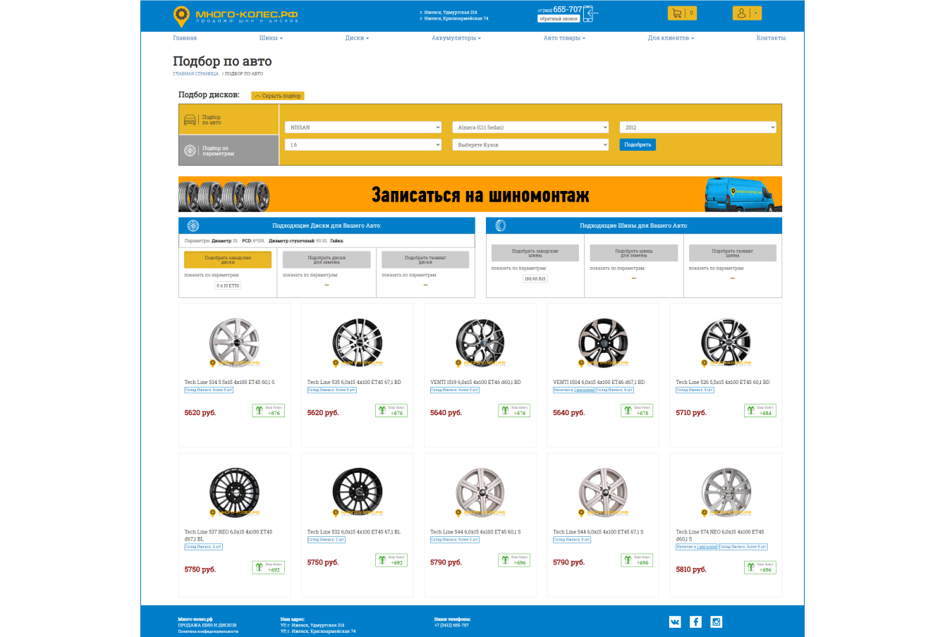 Отдельной задачей было найти адекватную и свежую базу шин и дисков, чтобы при поиске она нормально сопоставлялась с товарами из 1С и выдавала правильные результаты при подборе колес через марку авто. Саму базу шин и дисков "расшарили" и сделали возможность визуально прямо на сайте "примерить" шины и диски к своему автомобилю.