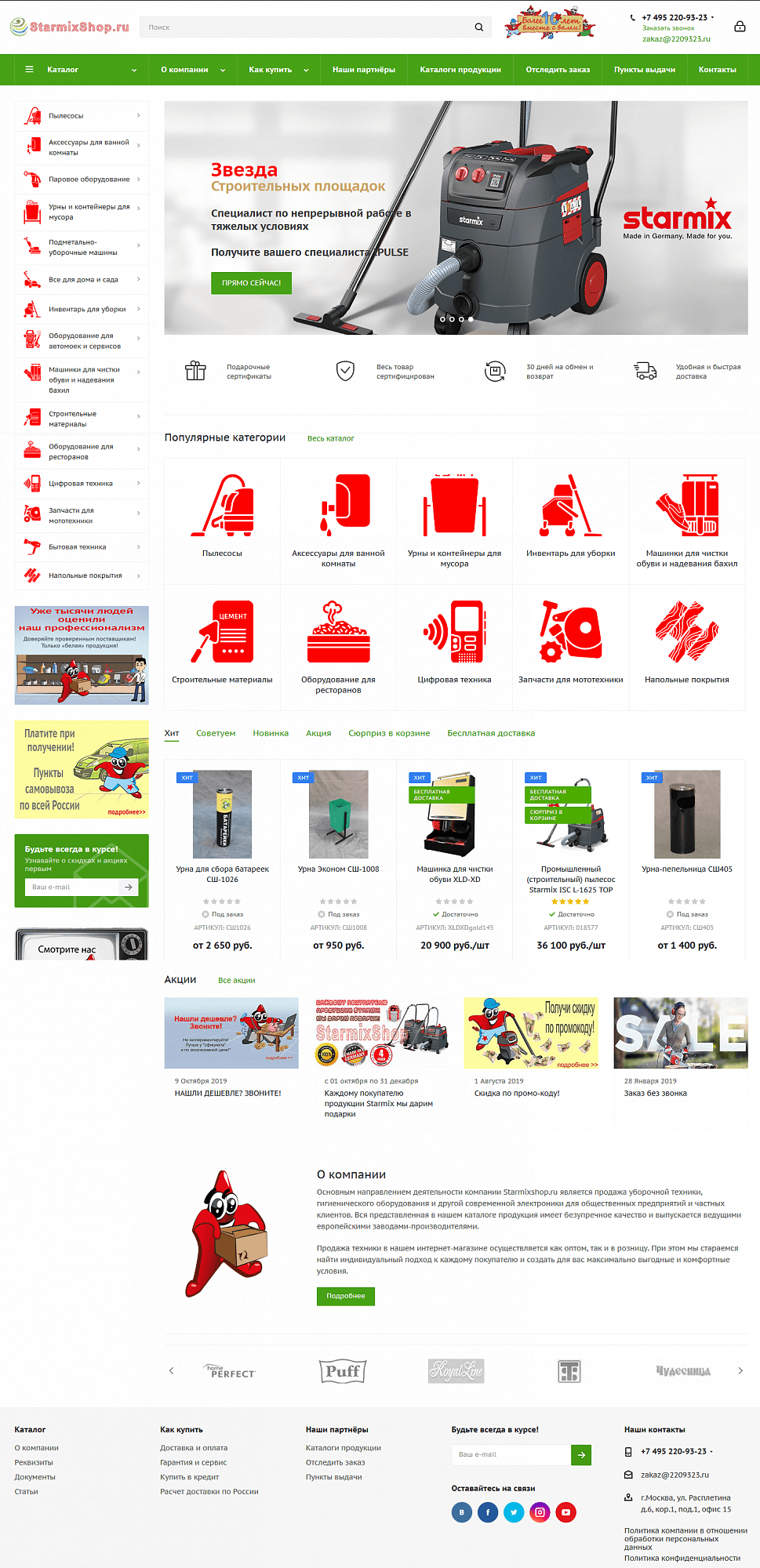Компания более 10 лет занимается продажей оборудования для уборки, а именно: пылесосов, подметальных и уборочных машин, парового оборудования, инвентаря и комплектующих для уборки. Компания находится в Москве, но продукция поставляется во все регионы России.