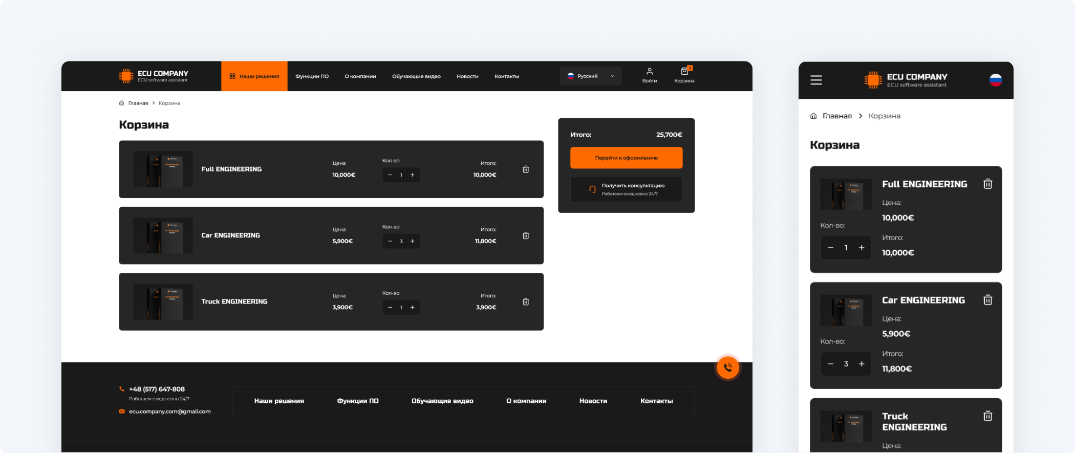 Корзина спроектирована как удобный и быстрый этап принятия решения о покупке. Пользователь видит перечень выбранных модулей и их стоимость, а также может в один клик изменить количество позиций, удалить ненужные элементы или сразу перейти к оформлению заказа.