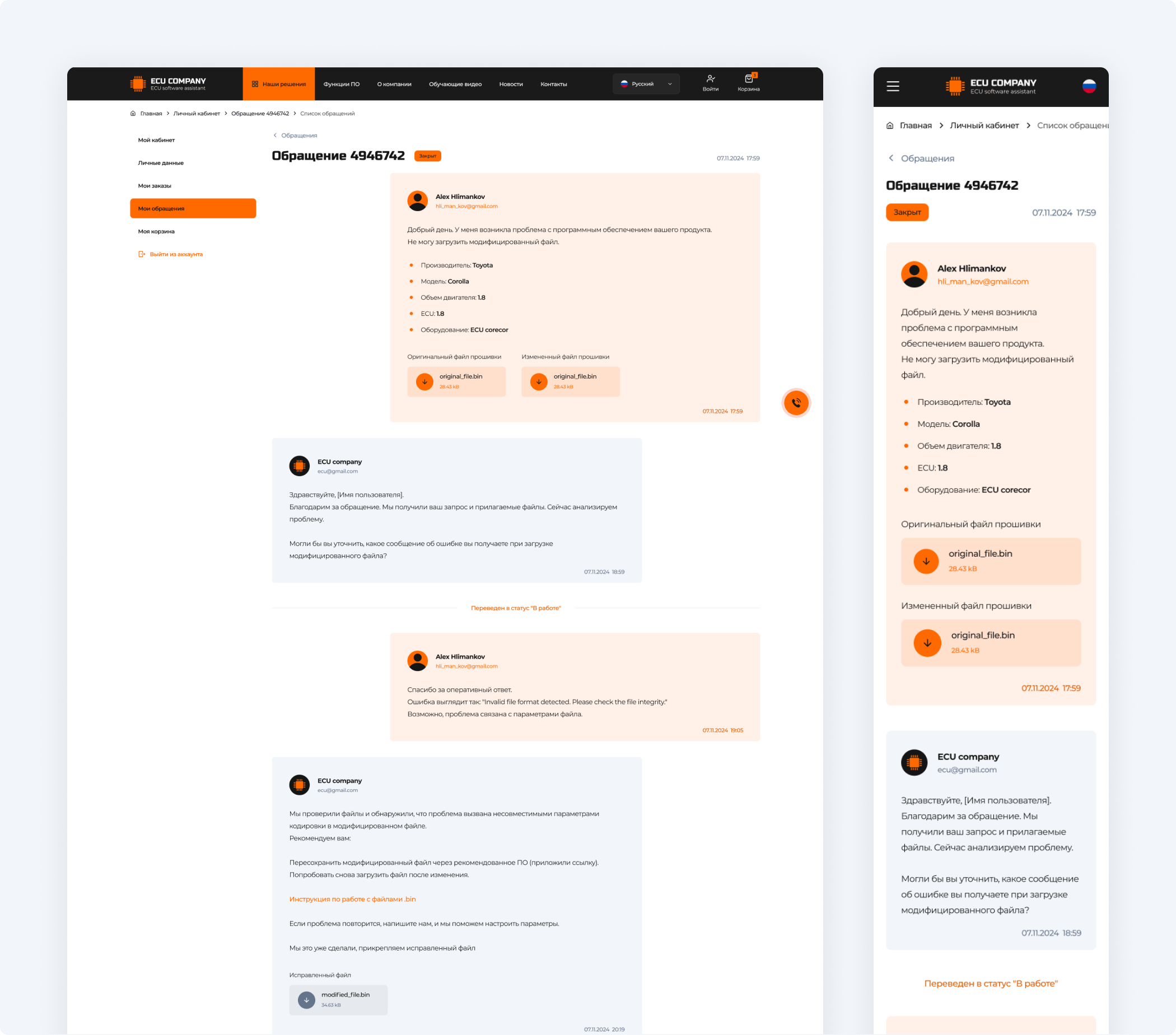 Для обеспечения качественной поддержки пользователей была внедрена система обращений, доступная прямо в личном кабинете. Клиент может создать тикет, загрузить исходный и изменённый файл прошивки, указать параметры автомобиля и подробно описать возникшую задачу.