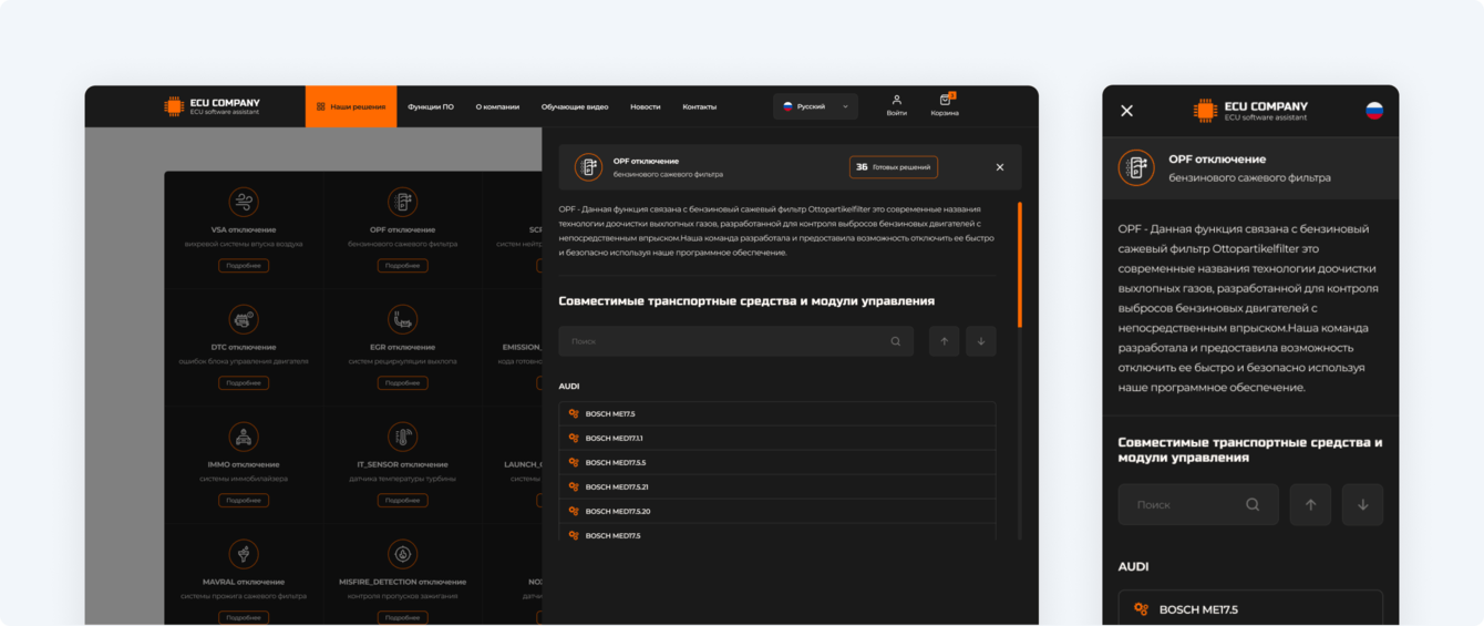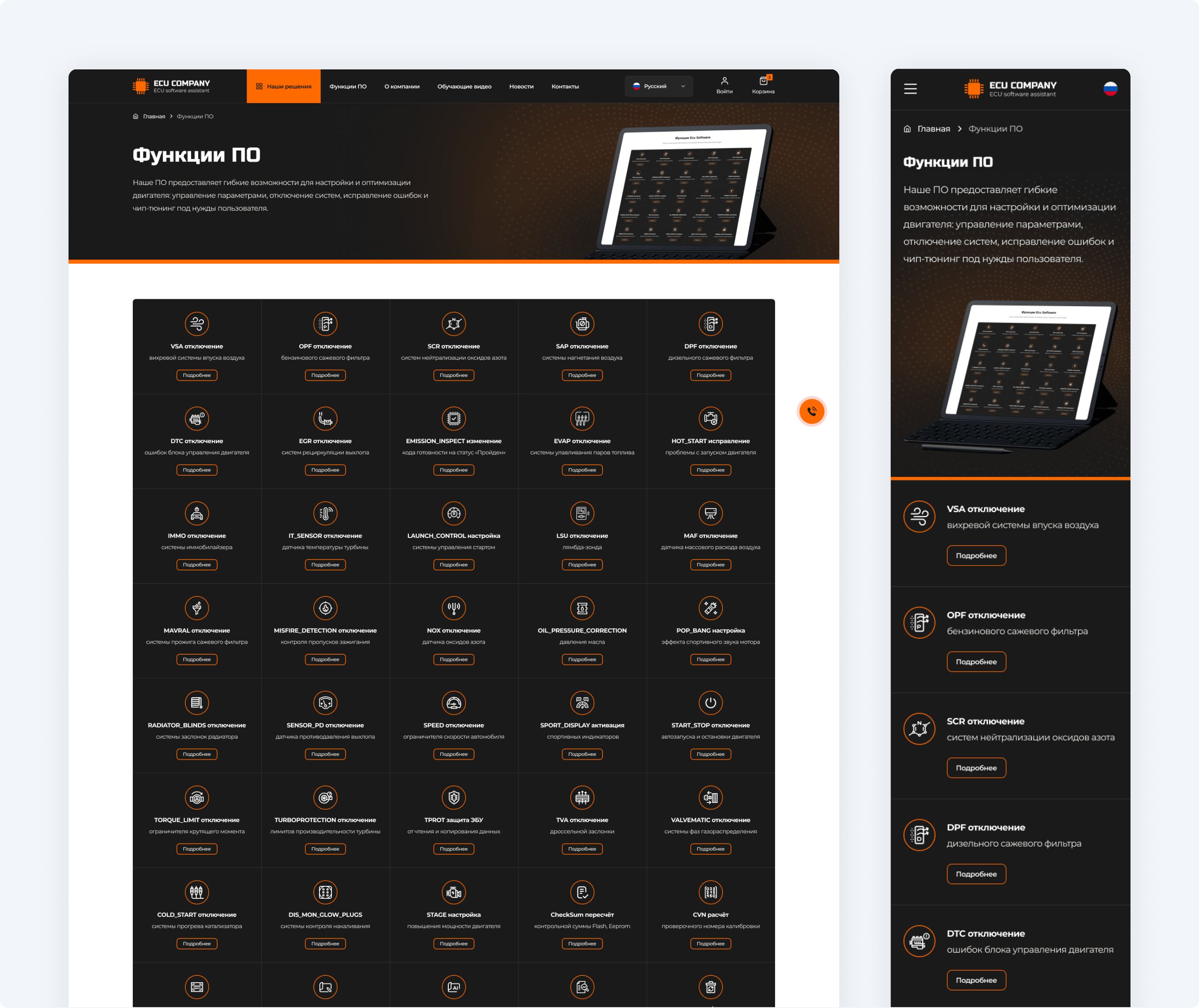 Для наглядной демонстрации возможностей программного обеспечения был разработан отдельный функциональный раздел, в котором каждая опция представлена подробно и структурировано — от работы с DPF, EGR, VSA и DTC до управления температурными датчиками и иммобилайзером. Все функции оформлены в формате интерактивных карточек с пояснениями и кнопкой «Подробнее», что упрощает знакомство с возможностями ПО и повышает вовлечённость пользователей.