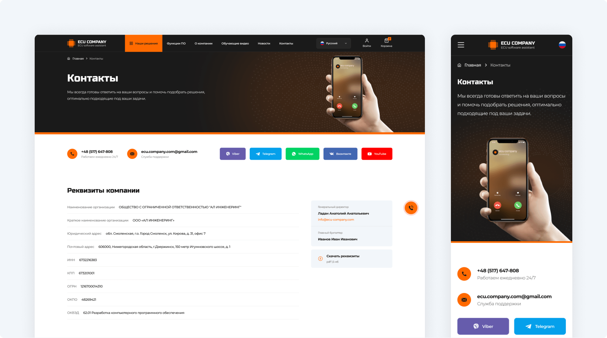Контактный раздел спроектирован с акцентом на удобство и скорость коммуникации. Пользователь может выбрать подходящий способ связи — по телефону, электронной почте или через мессенджеры и сервисы: Viber, Telegram, WhatsApp, «ВКонтакте», а также официальный YouTube-канал. Все элементы являются кликабельными. В нижней части страницы размещён блок с полными юридическими реквизитами компании.
