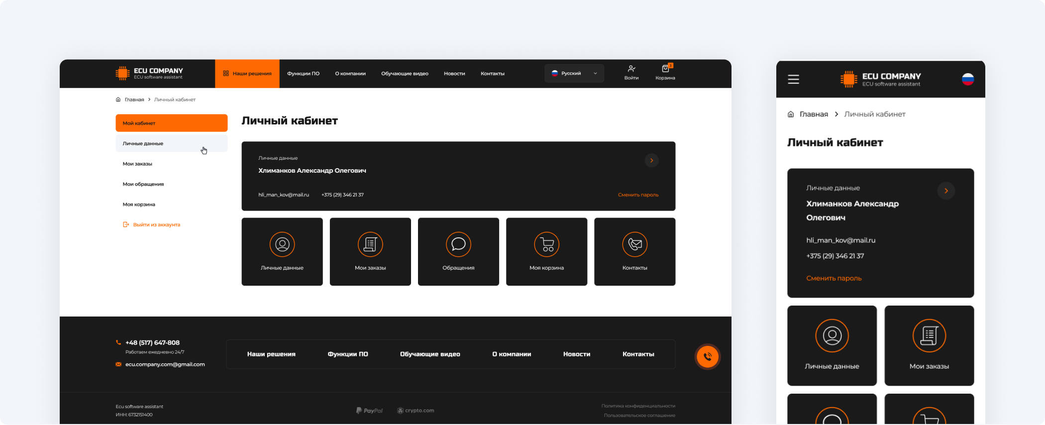 • Реализован личный кабинет с доступом к лицензиям, истории заказов, файлам, инструкциям и системе технической поддержки.