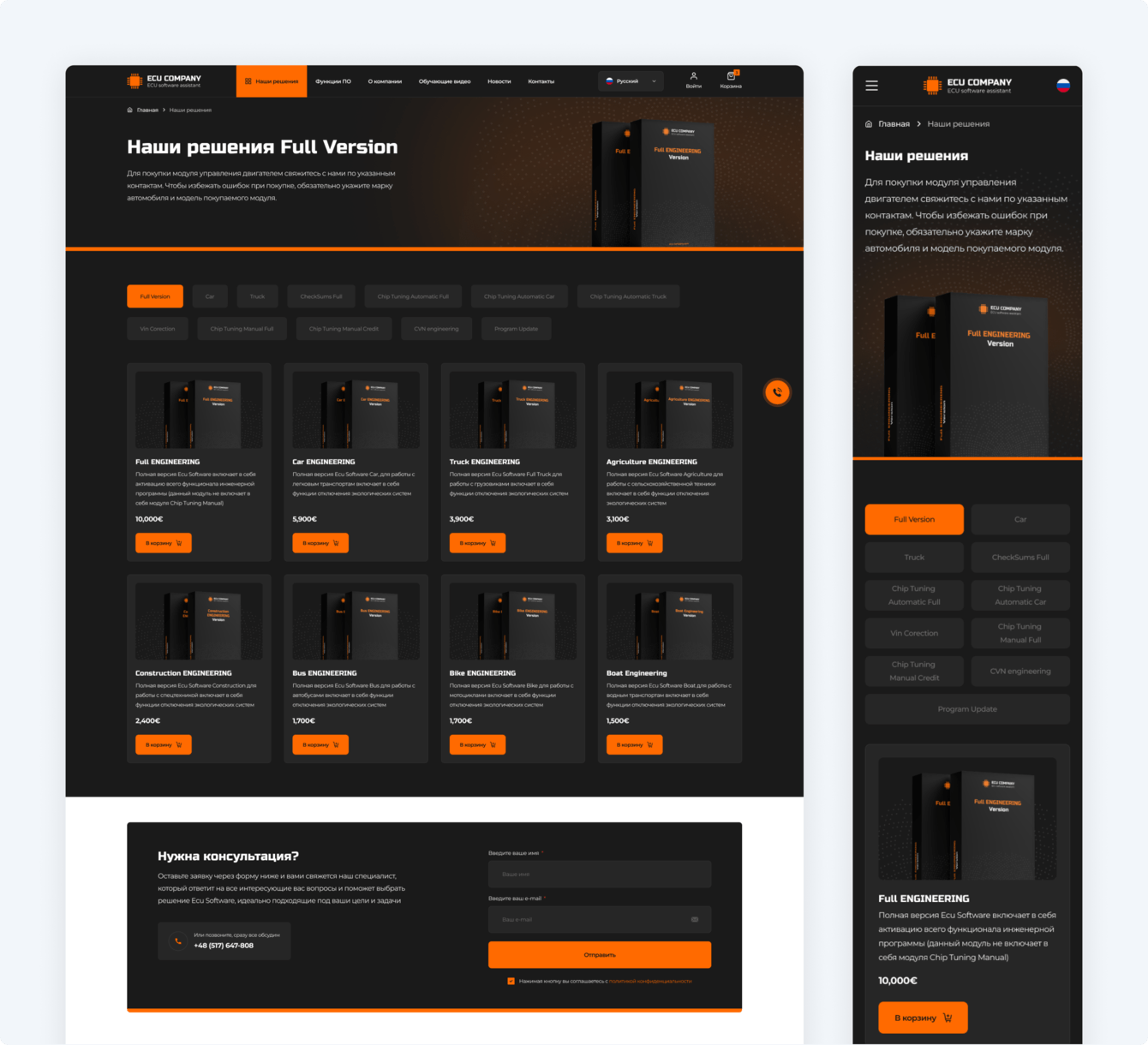 Проект для Ecu Software стал задачей повышенной технической сложности, где важно было выстроить не просто интернет-магазин, а полноценную экосистему для продажи и сопровождения программного продукта. Мы сфокусировались на том, чтобы сайт одинаково эффективно решал задачи презентации функционала, удобной покупки лицензий и поддержки пользователей после сделки.