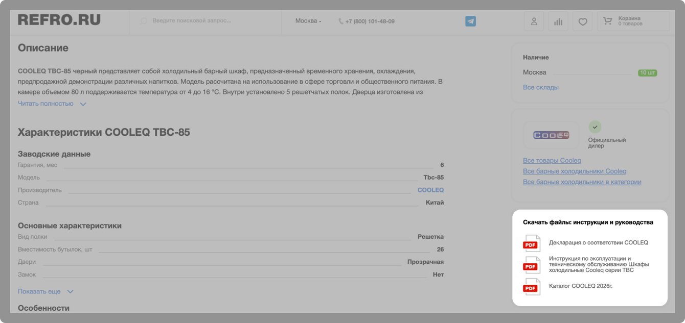 Вывели блок с документацией к каждому товару, что позволяет покупателям ознакомиться с сертификатами и другими документами, подтверждающими качество техники: