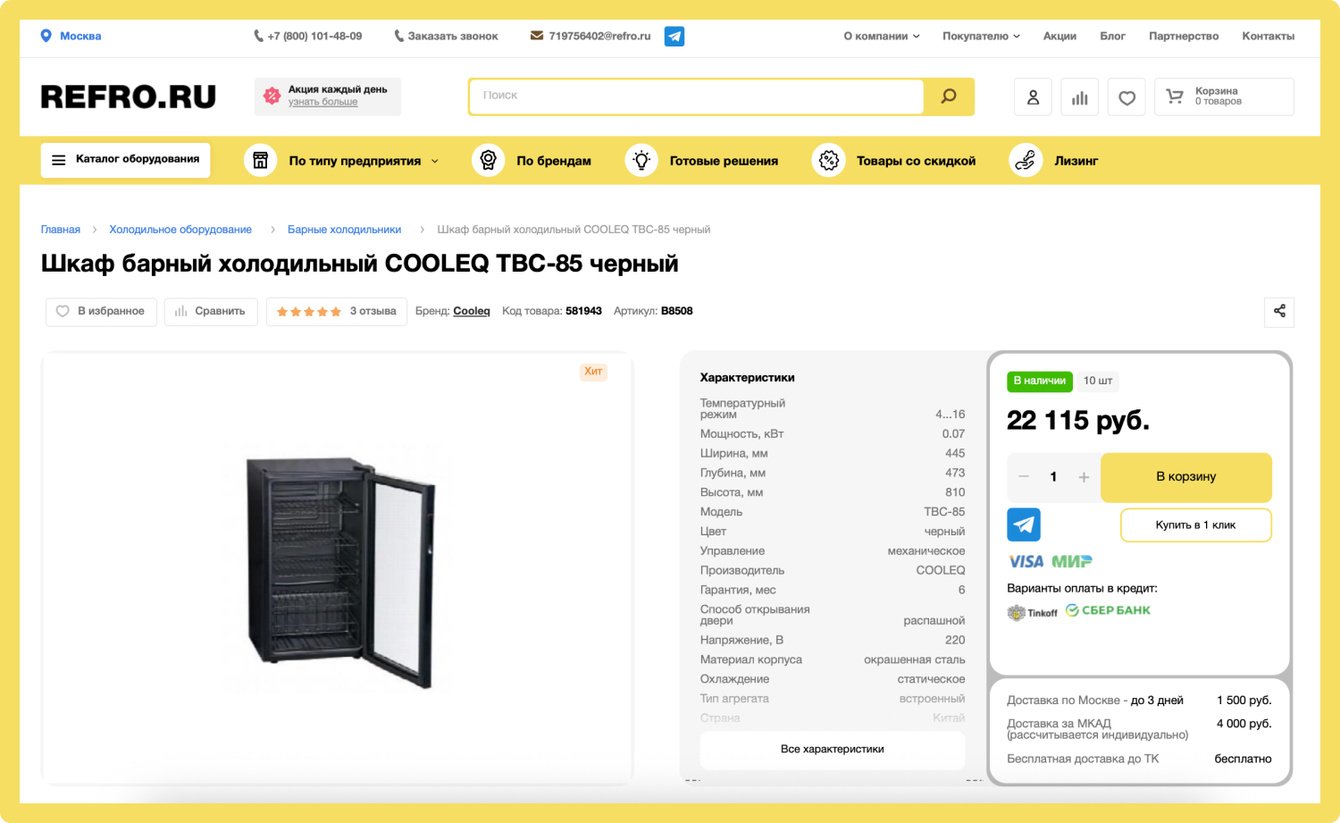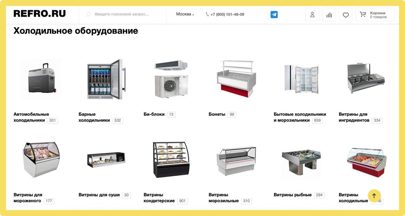 Компания Рефро является поставщиком оборудования для ресторанов, кафе, магазинов. Клиент обратился к нам с задачей создать удобный интернет-магазин для работы с большим каталогом товаров.
