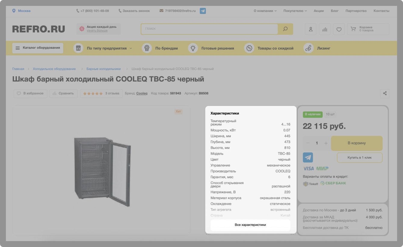 При выборе подходящего товара покупатели часто ориентируются на их основные характеристики: размер, цвет, производитель и прочее. Чтобы сократить путь пользователя от поиска товара до совершения покупки, в каталоге мы вывели все основные характеристики к каждому товару. Это позволяет легче ориентироваться в товарах и быстрее находить необходимое оборудование