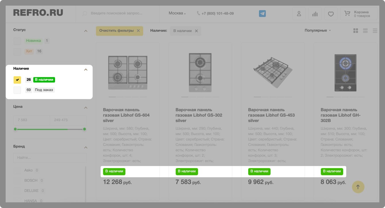 Также была доработка по наличию товаров: в наличие, под заказ.