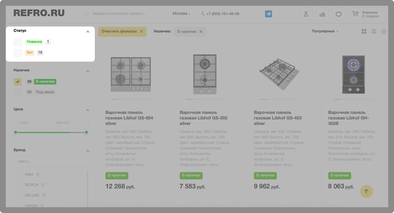 Мы произвели доработку фильтра по статусам товаров: хит, новинка