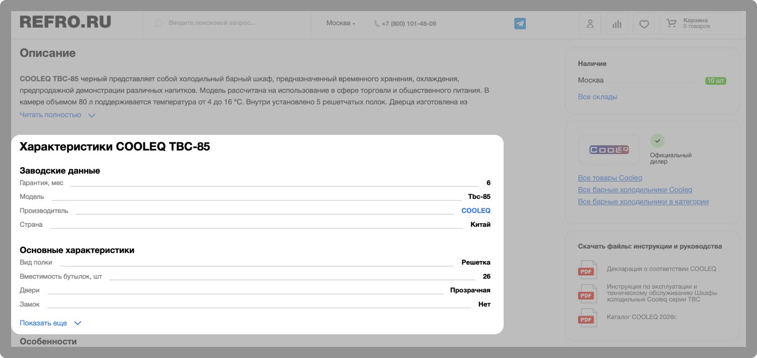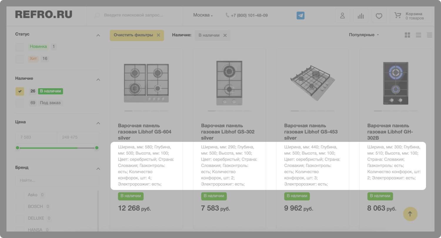При выборе подходящего товара покупатели часто ориентируются на их основные характеристики: размер, цвет, производитель и прочее. Чтобы сократить путь пользователя от поиска товара до совершения покупки, в каталоге мы вывели все основные характеристики к каждому товару. Это позволяет легче ориентироваться в товарах и быстрее находить необходимое оборудование