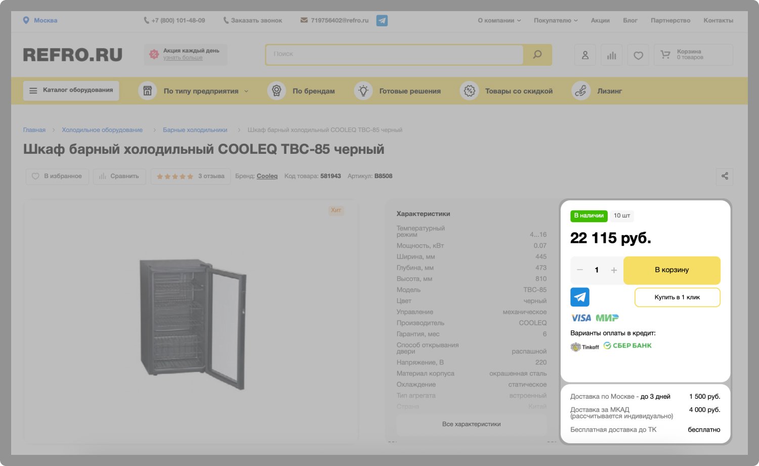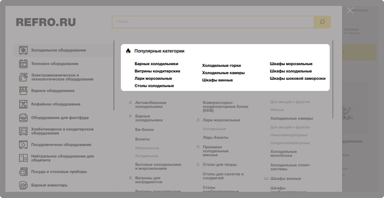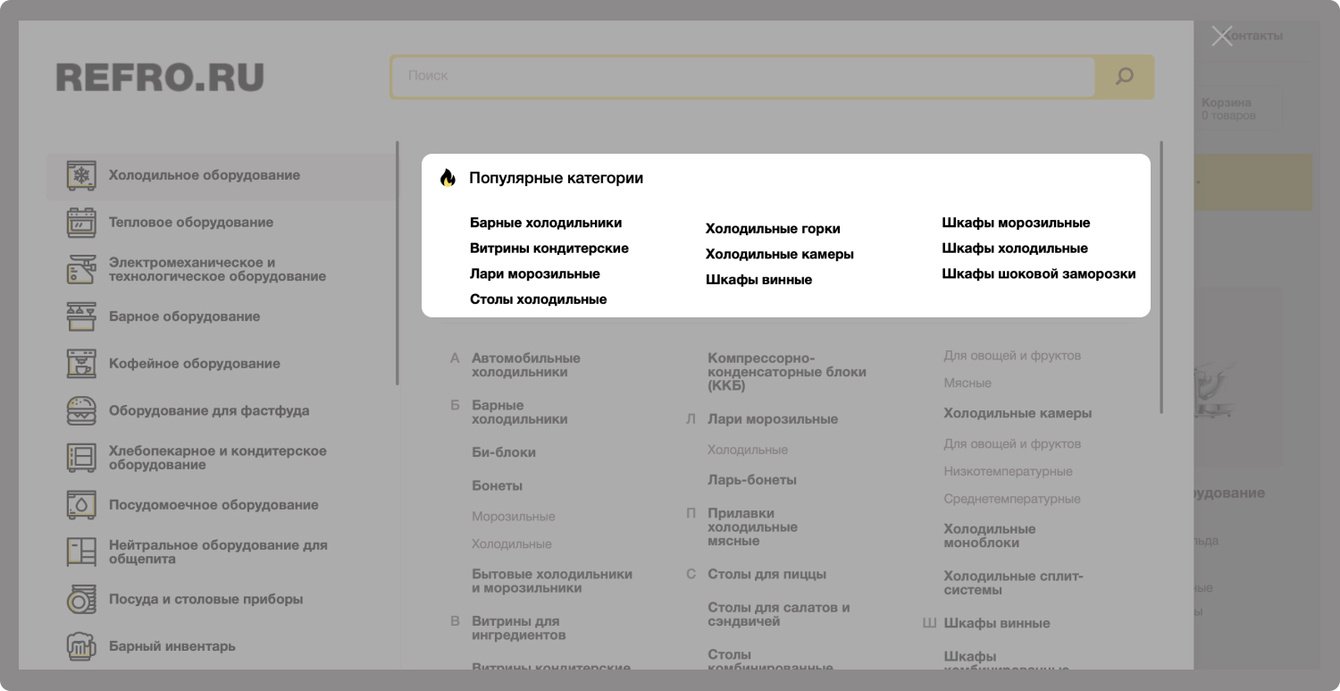 Компания Рефро является поставщиком оборудования для ресторанов, кафе, магазинов. Клиент обратился к нам с задачей создать удобный интернет-магазин для работы с большим каталогом товаров.