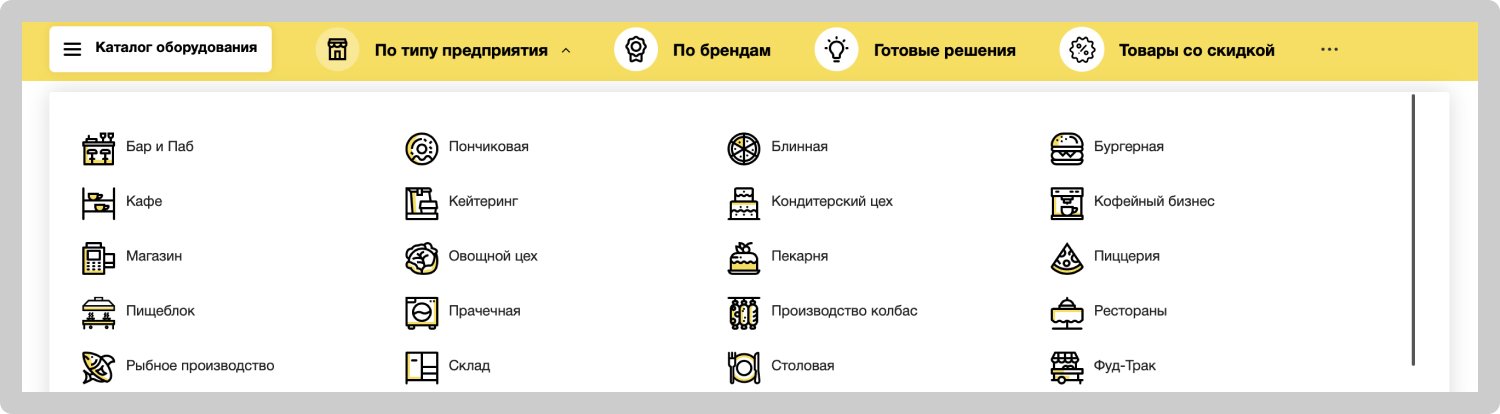 Выводили отдельно кнопку каталога, а также вывели каталог товаров, разделенный по направлениям: по типу предприятия, по брендам, товары со скидкой и прочее.