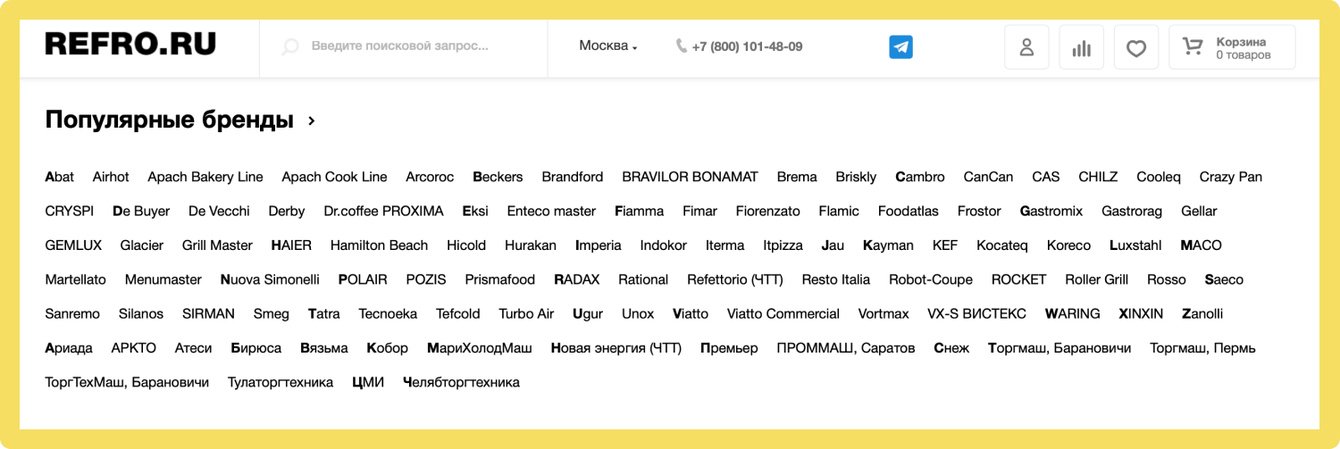 На главную страницу вывели блок с поиском товаров по брендам, так как данный вид поиска является удобным для многих покупателей