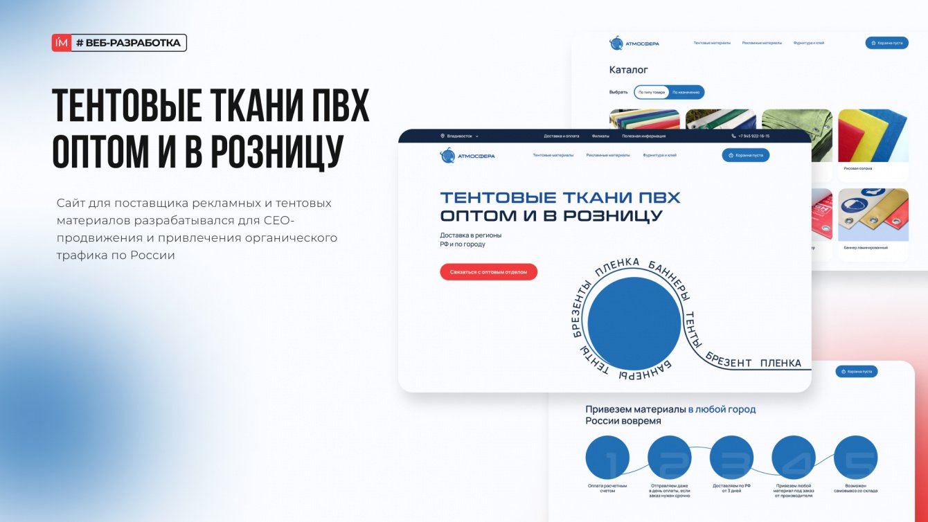 Сайт для поставщика рекламных и тентовых материалов разрабатывался для СЕО-продвижения и привлечения органического трафика по России.