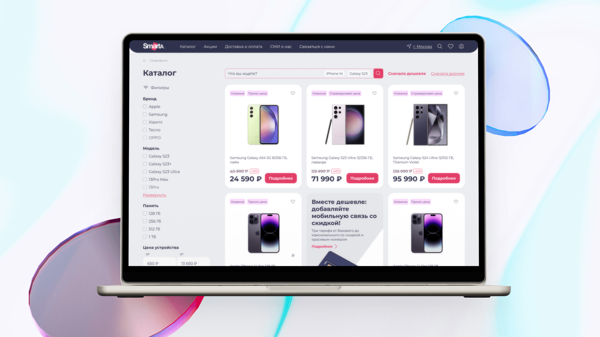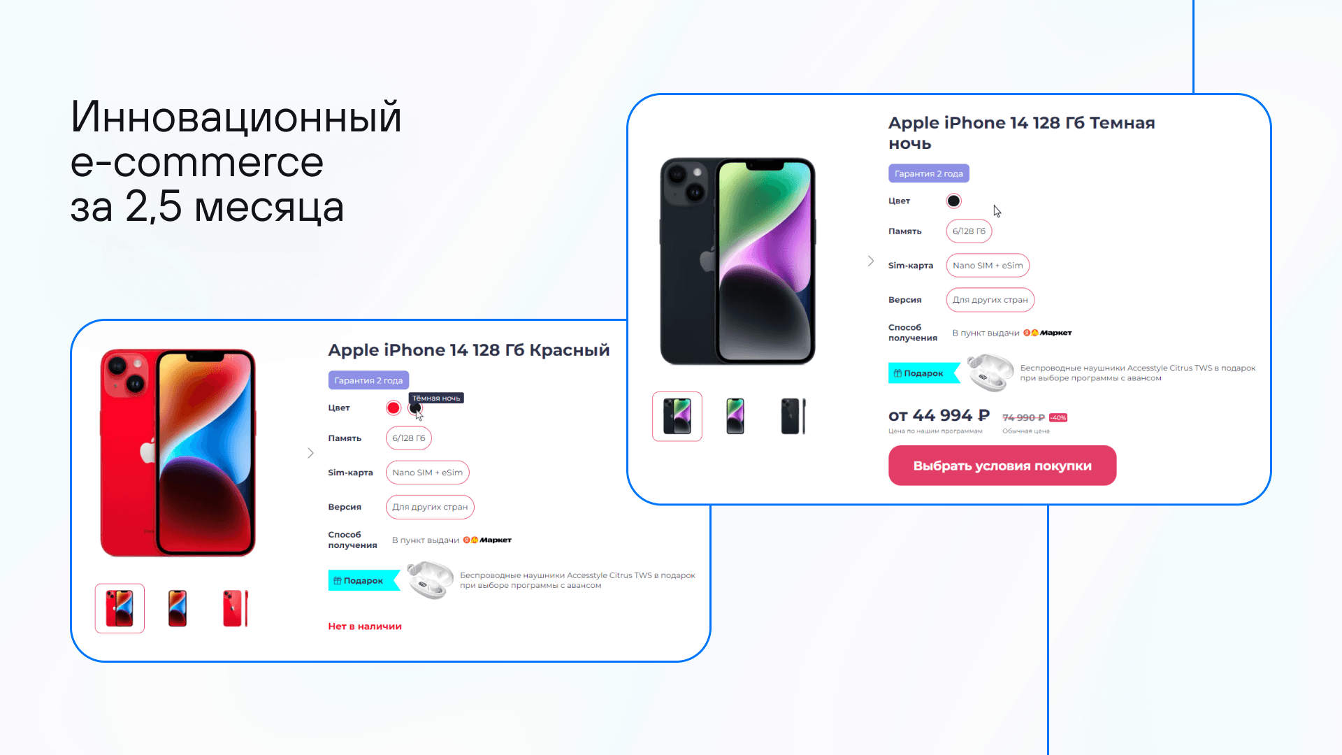 Одним из ключевых элементов стала карточка товара со сложной логикой отображения. Благодаря ей пользователь может просмотреть весь модельный ряд смартфона на одной странице, переключая опции — цвет, объем памяти, комплектацию и другие параметры.
